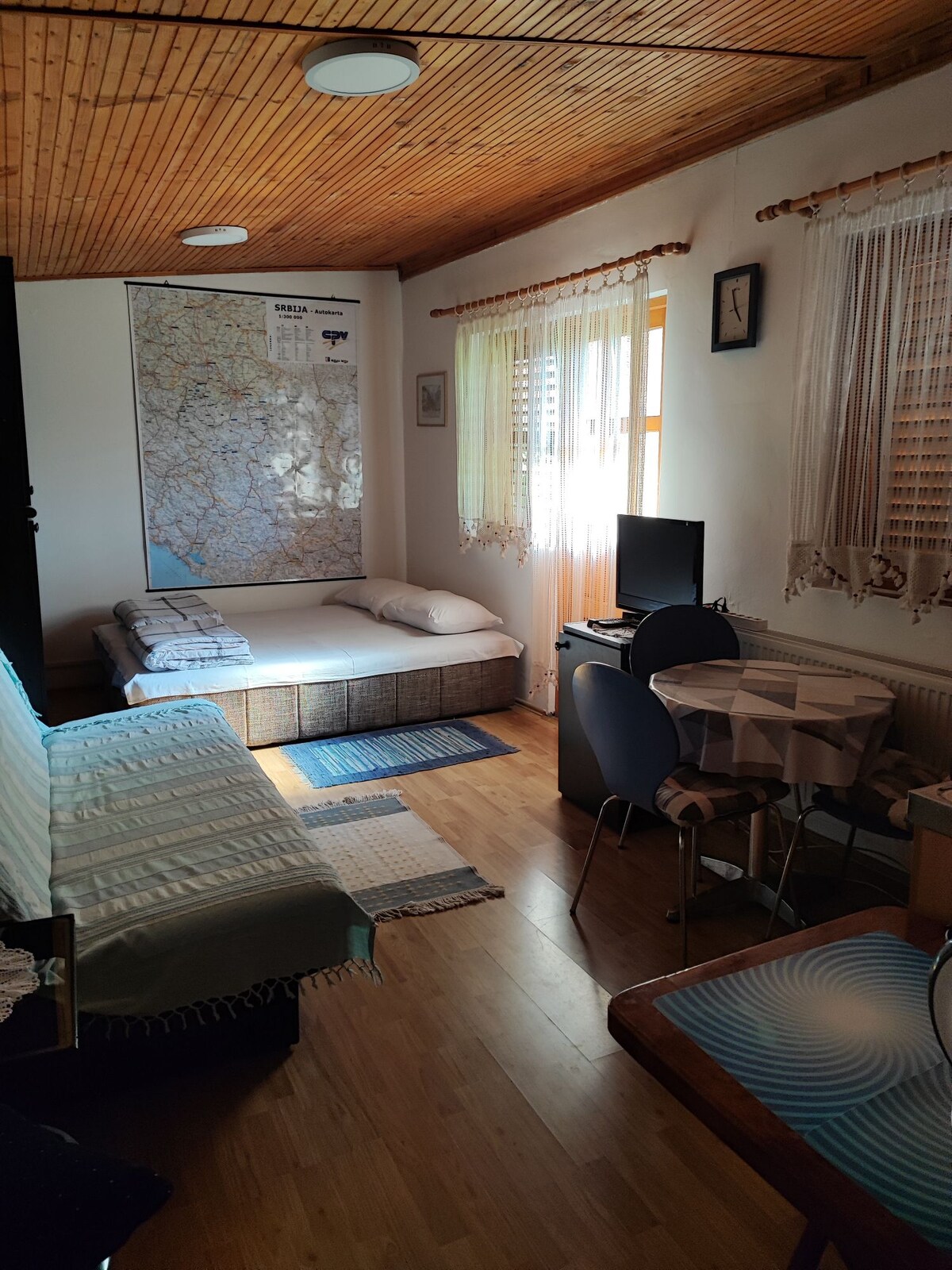 Naše stanovanje se nahaja v mirnem delu Novega Sada, kjer boste vedno zlahka našli parkirno mesto. Še vedno nismo tako daleč od središča mesta in le nekaj korakov stran od mestne javne plaže Strand. V prenočišču je prostoren prostor, ki vključuje bivalni prostor z dvema kavčema in samooskrbnim akvarijem, dobro opremljeno kuhinjo, jedilnico in delovni prostor. V spalnici poleg zelo udobne postelje boste našli tudi majhen delovni prostor, omaro za svoje stvari in veliko ogledalo. Zelo čista kopalnica.