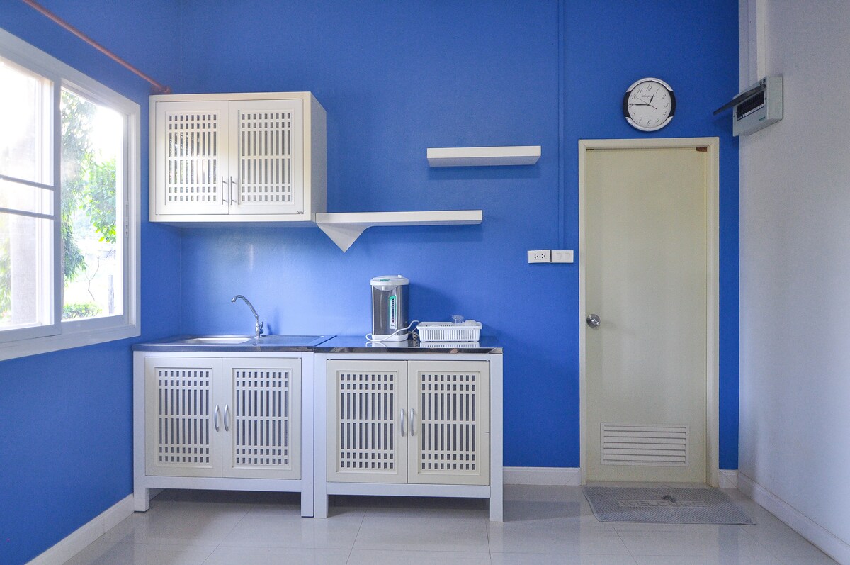 2 bedrooms with a connecting door - Each room has 2 single beds and 1 high bed - Two extra single beds can be added for 200 THB per bed. 2 bathrooms Bread and instant coffee or cocoa will be served at the eating area from 6-10 am. The main door opens on 6 am and will closed on 10 pm for security reason.