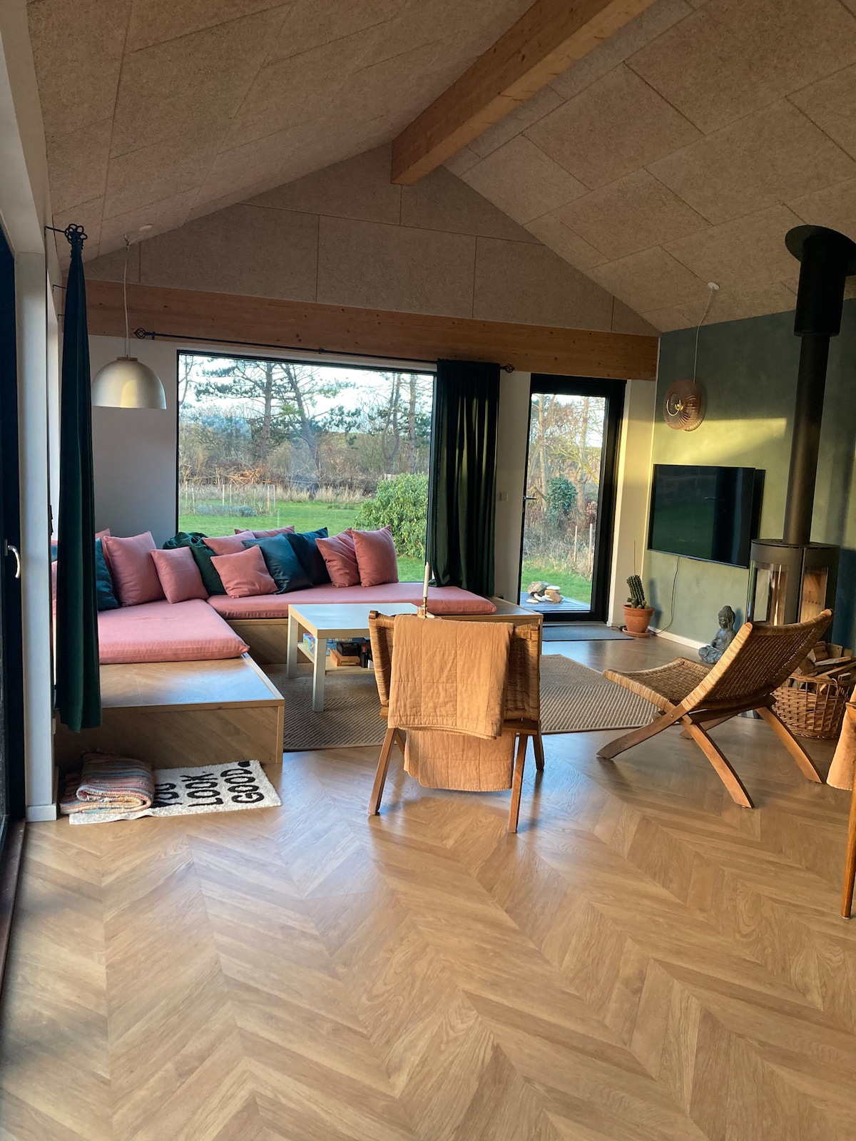 Vi har brugt lang tid på at renovere vores lille træhus med upcyclede byggematerialer, indrettet det med arvestykker og loppefund, og er nu klar til at få gæster på besøg. Huset ligger i vores frugthave, tæt på natur, skov, gode strande, middelalderbyer, Fuglsang Kunstmuseum og langt fra larm - med undtagelse af vores vagtler og fritgående silkehøns, som godt kan finde på at gale engang imellem. Huset er 24 kvm stort, og har derudover en hems med sengepladser nok til fire personer.