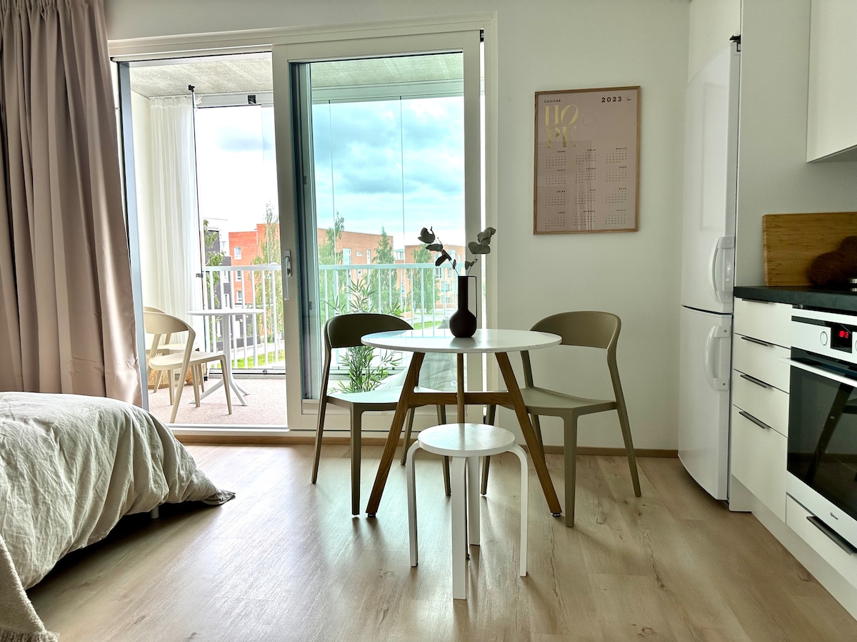Čudovit studio na odlični lokaciji! Svetel in prostoren studio se nahaja tik ob parku Ainola. Kratek sprehod do centra. Stanovanje ima visokokakovostno opremo: npr. indukcijski štedilnik, integriran pomivalni stroj, integrirana pečica, sušilni stroj. Stanovanje ima elegantno notranjost in čudovito posodo. Na voljo je 160 cm zakonska postelja in tretja postelja kot zračna vzmetnica. Velik zastekljen balkon s sedežno skupino. 43-palčni pametni televizor (npr. Netflix), hitri internet (200/200).