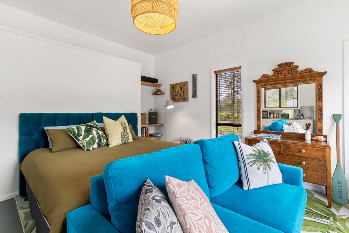 Ta miren studio, ki je kot nalašč za romantični pobeg, miren oddih ali sproščeno deskanje, ima vse, kar potrebujete, da se sprostite in ponovno povežete. Prenočišče se nahaja med drevesi, le minuto stran od neokrnjene plaže Grassy Head, ki je idealen kraj za sprostitev in polnjenje baterij. Sprostite se v zasebnem spa, poslušajte ptice in uživajte v razkošnem pogledu na gozd – ali pa pojdite deskat, plavat ali na sprehod po obali. Ta skriti dragulj je tiho, udobno in obdano z naravo ter je popoln pobeg na obalo.