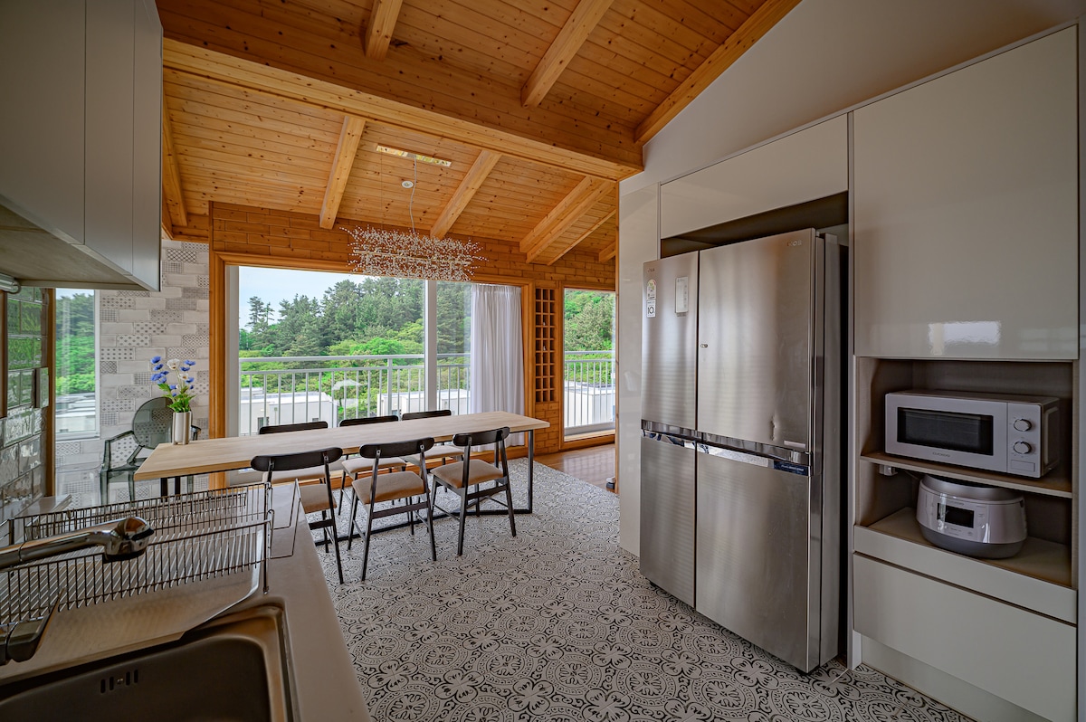 아름다운 함덕 바다가 보이는 언덕 위 평화로운 주택가에 나만의 휴양지를 만들어 보세요. [위치] 공항과 멀지 않은 제주시 북동쪽에 위치하여 함덕 해수욕장, 사려니 숲, 만장굴, 한라산, 자연휴양림, 스누피 가든, 돌 문화 공원, 성산일출봉, 우도 등 제주의 대표적인 관광지들과 가깝고 차량 10분 거리내에 편의점, 대형마트, 레스토랑 등의 편의 시설이 가득합니다. [외관] 자연과 닮은 초록색 테라스, 밤에는 고기잡이 배들의 반짝거리는 불빛이 보이는 곳. 제주 바다가 보이는 언덕 위 예쁜 마을, 친절한 이웃들과 클래식한 돌담, 넓은 잔디 정원, 아름다운 감귤 밭으로 둘러 쌓인 고급 별장입니다. [인테리어] 고급 원목 가구들과 최신 가전제품, 각종 식기와 양념, 포근한 침구를 준비했습니다. 에드워드 호퍼의 그림들과 싱그러운 꽃과 나무들로 꾸며진 숙소가 여러분의 쾌적한 스테이를 보장하여 드립니다.