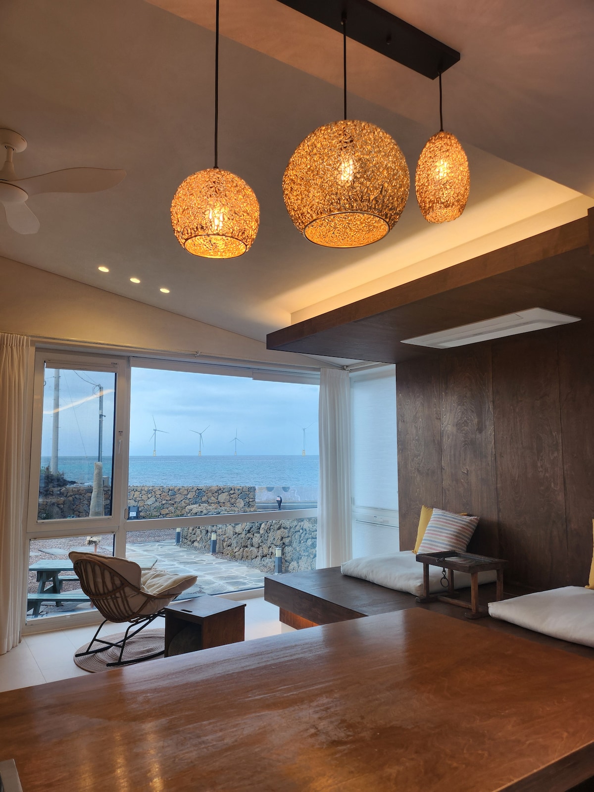 Zasebna vrhunska vila z bazenom, kjer lahko uživate v razgledu na ocean in gore Hallasan. Ta luksuzna vila s pogledom na ocean, ki je zasnovana samo za eno skupino naenkrat, ponuja popolno zasebnost in udobje. Sprostite se ob velikem zunanjem kaminu in uživajte v prijetni noči pod zvezdami. Neskončni bazen na strehi ponuja osupljiv razgled — kot nalašč za sprostitev ali zasebno zabavo. Doživite pravo razkošje in spokojnost, obkrožena z naravo Jejuja. 🌿🌊🔥