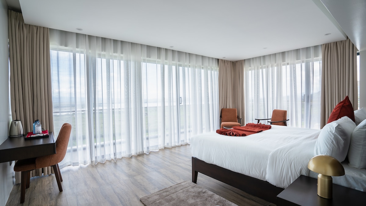 A bright, chic 1-bedroom loft with modern interiors, a full kitchen, and serene lake-facing spaces. Perfect for couples or solo travelers seeking peace and comfort. Enjoy shared access to the villa’s pool, padel court, mini-golf, scenic gardens, bonfire evenings, nature walks, and optional private chef services.