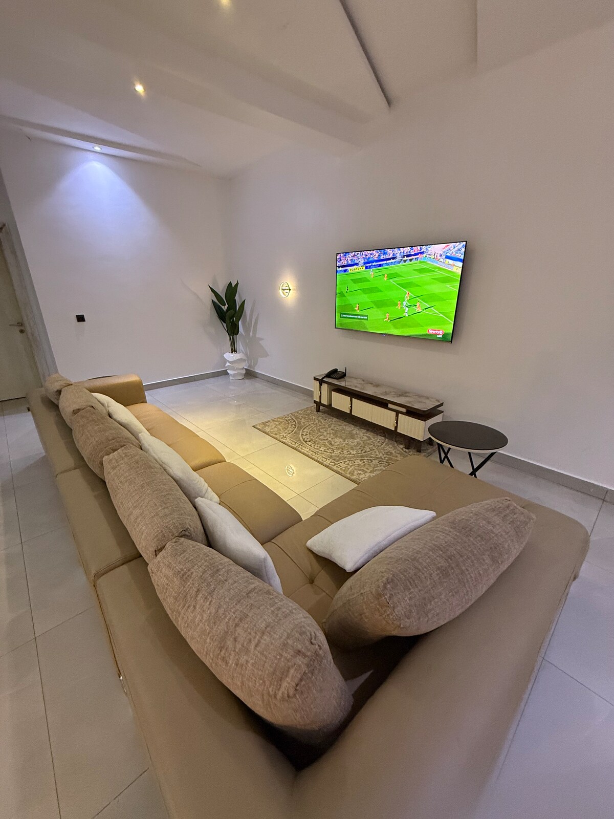 ✨ Luxury 3-Bedroom Apartment in Jahi, Abuja Step into comfort and sophistication in this modern 3-bed, 3-bath apartment near Jahi Mall and Shafa Fuel Station. The spacious living room features a large smart TV with Netflix, plush sofas, and ambient lighting for cozy relaxation. Enjoy a fully equipped kitchen, stylish dining area, and serene bedrooms—perfect for families, travelers, and business guests seeking premium comfort in one of Abuja’s most desirable neighborhoods.
