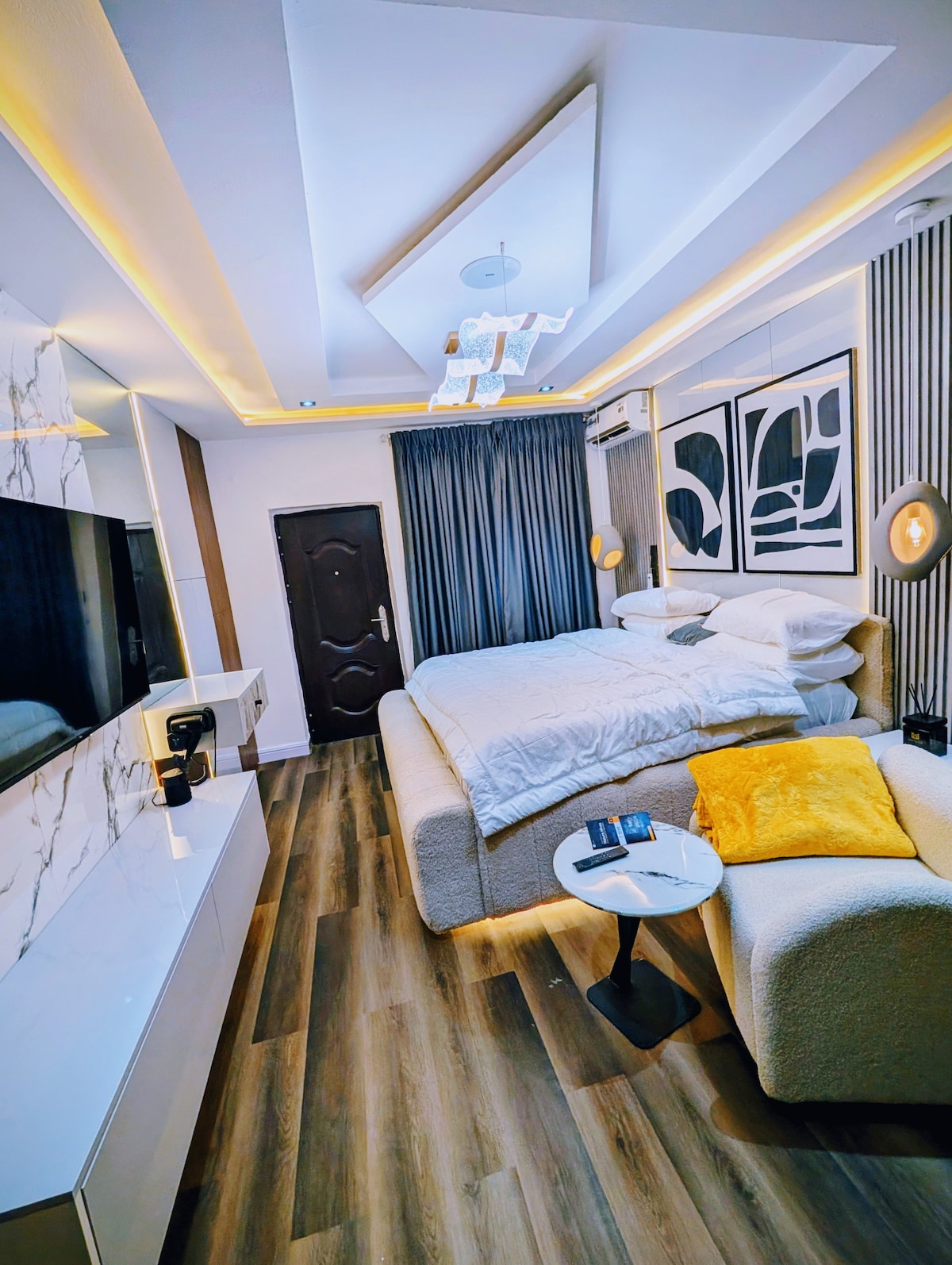 Royalty Luxury Serviced Apartment je bil zasnovan in zasnovan kot prenočišče za kraljeve družine. Je miren, edinstven, eleganten in domač z izvrstno opremo, ki daje občutek udobnega doma. Nahaja se na mirnem zavarovanem ograjenem posestvu in ponuja priročen dostop do vseh delov Abuje in okolice. 247 elektrika s sončnimi/inverterskimi sistemi, optični Wi-Fi, ventilator, popolnoma opremljena sodobna kuhinja, oborožena varnost, mirna soseska. Standardna biljardna miza, gugalnica za sprostitev, zasebni bazen in pralni stroj.