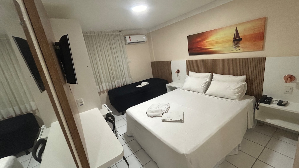 Quarto Triplo confortável e completo, perfeito para famílias, amigos ou viagens a trabalho! O espaço conta com 1 cama King e 1 cama de solteiro, acomodando confortavelmente até três pessoas. O ambiente possui ar-condicionado, Wi-Fi gratuito,TV, além de um espaço dedicado para trabalho. Tem localização privilegiada e bem localizada, fica próximo à praia, restaurantes e comércios. Conforto, praticidade e ótima localização em um só lugar. Reserve já e aproveite uma estadia inesquecível!