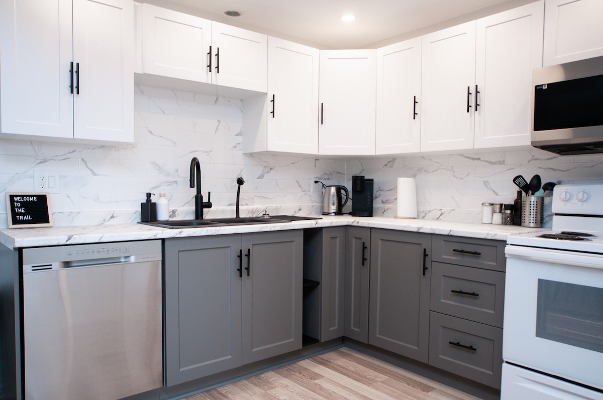 Welcome to The Trail Retreat apartment! This newly-renovated apartment is ideal to relax and recharge with your family for short or extended stays in town, or pit stop on your way to Price Edward County! Located in a quiet area, our 2-bedroom apartment is a 3-minute drive (15-minute walk) to the heart of downtown, Trenton &Trent Valley Lodge. Featuring free onsite parking, a 50-inch smart TV, ensuite laundry, and a fully stocked kitchen. 20 mins to Presqu'ile Prov Park, 47 mins to Sandbanks.