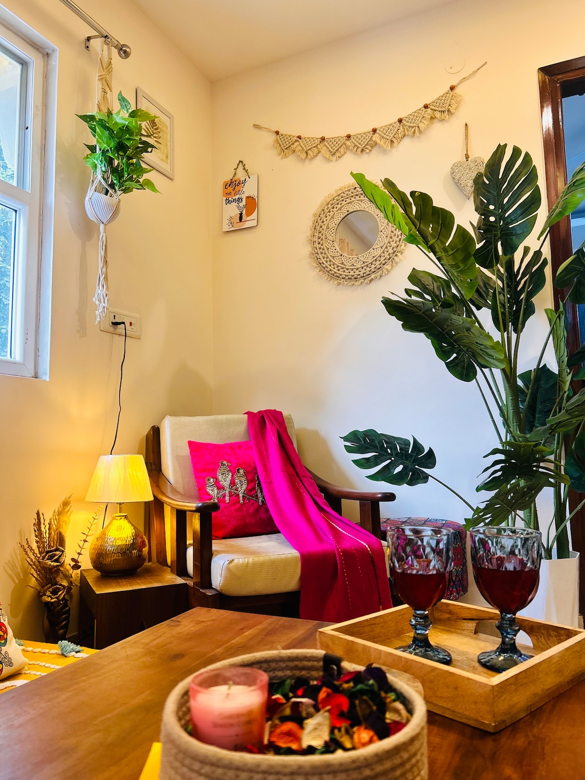 Discover unparalleled comfort in our Boho chic 1 BHK suite in Gurgaon. Enjoy a cozy living area, well-equipped kitchen, a lively bedroom, modern bathroom, and a balcony with stunning views. Stylish living space with books, board games, plants, and boho chic decor. Immerse yourself in luxury with full power backup and 24x7 security. Your comfort is our priority – experience a stay where every detail is crafted for your delight. Reserve now for a unique blend of sophistication and warmth!