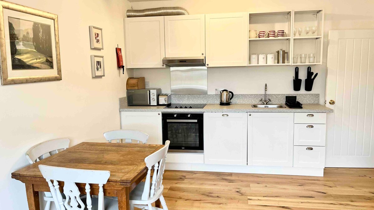 Mirno 1-posteljno stanovanje v osrčju podeželskega kraja East Lothian, 150 metrov od destilarne viskija. Avto je bistvenega pomena. Stanovanje je del najinega doma, vendar ima lastna vhodna vrata/objekte. Kuhinja s kuhalno ploščo, pečico, pomivalnim strojem. Spalnica z zakonsko posteljo. Kopalnica v spalnici z veliko prho. Dnevna soba z obokanim stropom; vrtna vrata na teraso, ki vodijo do zadnjega vrta. Prostor za sedenje pred vrtom. Naše dovoljenje za kratkotrajni zakup: EL00074F Ocena EPC: C
