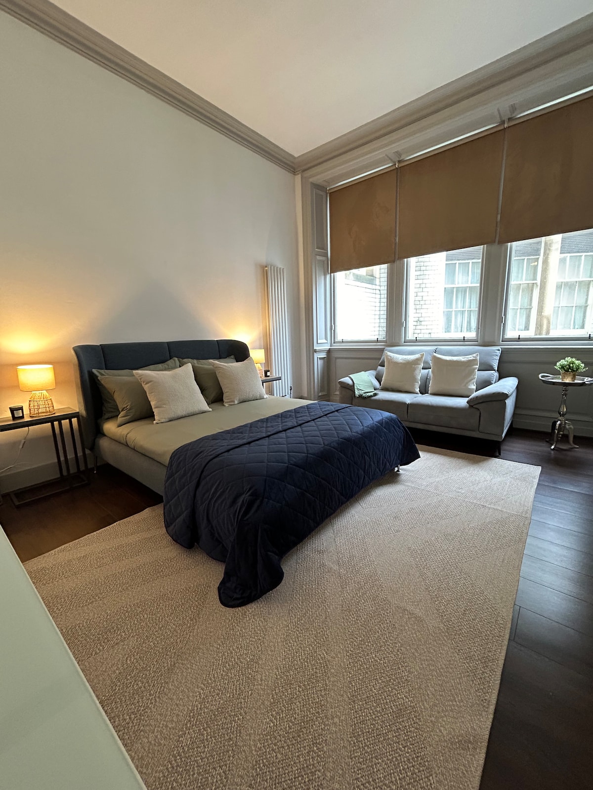 Spacious and bright rooms with large original sash windows provide a gorgeous light to this hidden Edinburgh gem a few steps away from the Royal Mile. The bedroom is fitted with king-size bed, feather bedding, and wooden window shutters to ensure the best sleep possible during your stay. Iconic Design Classics such as Jean Prouvé chairs, and Serge Mouille lamps happily co-exist with antique local finds. A beautiful & stylish retreat to escape to - we are sure you will love your stay.