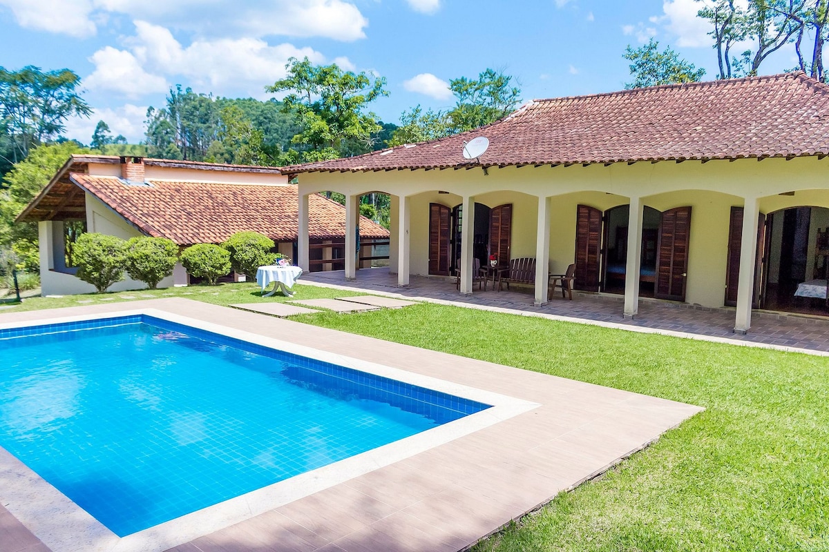 Aproveite o conforto de uma casa tranquila, cheia de charme, ampla e equipada com todas as comodidades! com acesso super fácil e tranquilo. Somos pet friedly e os pets são bem vindos aqui na casa :-) Cozinha planejada com fogão e forno a lenha e churrasqueira, rede para descanso com visão para a área da piscina, lagos e montanhas. Venha desfrutar de um final de semana perfeito com a família ou amigos.