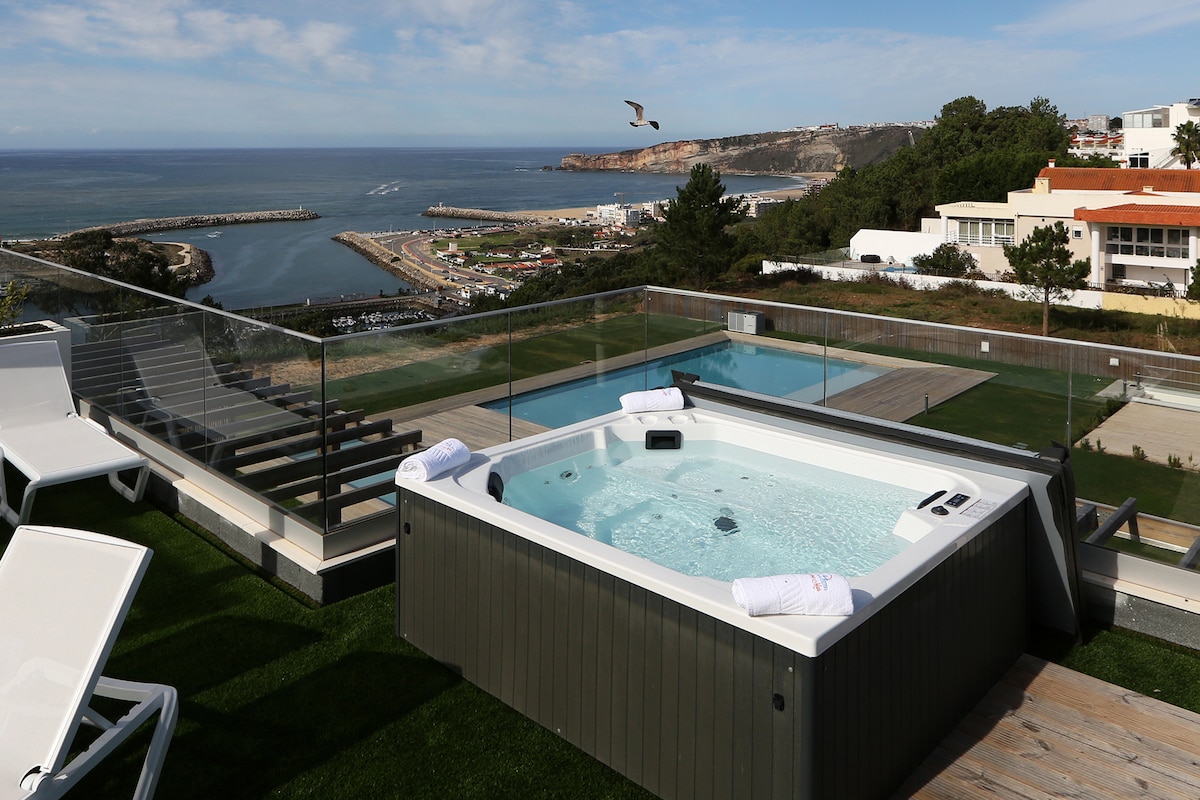 Stunning, luxurious apartment in Nazaré - perfect for holidays or workations! The apartment includes a cozy living room, 2 bedrooms, 2 bathrooms, a fully equipped kitchen, and indoor & outdoor dining areas. Guests enjoy free parking, gym, jacuzzi, and two pools with stunning ocean and Nazaré Canyon views. Everything you need for a comfortable, unforgettable stay surrounded by the beauty of nature.