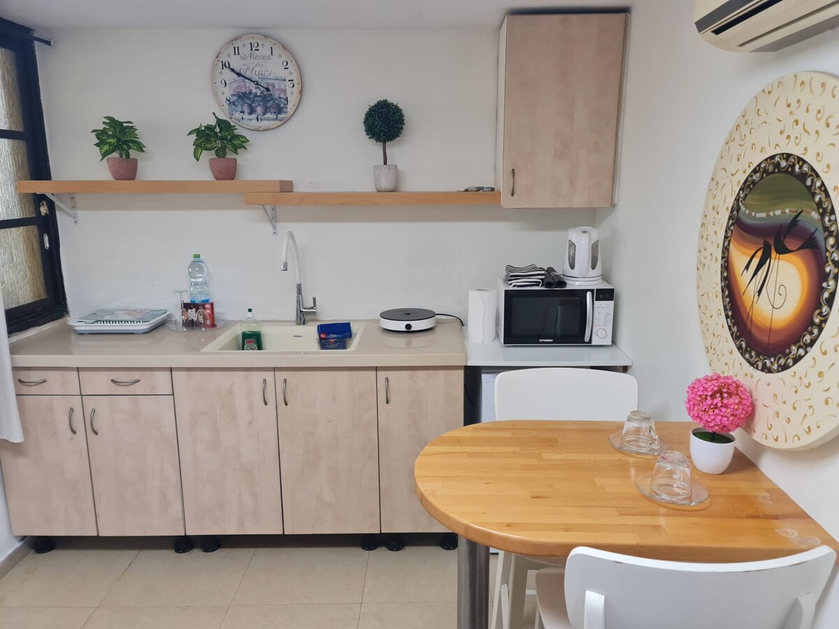 Garsonjera 36 m2 + terasa 12 m2, prenovljena. Udobno. 1 zakonska postelja + raztegljiv kavč za 2 dodatni osebi. Blizu vseh trgovin, v osrčju tržnice Natanya. 15 minut hoje do plaže. Ločena kopalnica, popolnoma opremljena kuhinja. Pralni stroj, TV , internet, klimatska naprava , shranjevanje. Posteljnina je zagotovljena. Na voljo je pripomočki za chabbat Ločene posode, mleko in meso. Sušilnik za lase, likalnik, opekač. Kratkoročni ali srednjeročni zakupi.