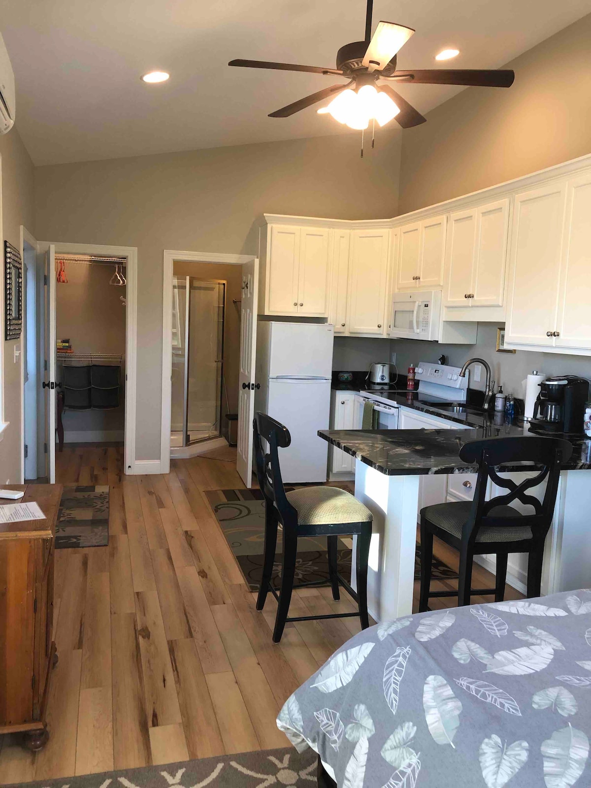 Bright, charming 408 sq ft studio apartment with a queen bed, work desk, lounge chair/ottoman, 3 piece private bathroom and kitchenette (sink, mini frig. & microwave). Also includes a dedicated closet, well stocked coffee station, smart TV, luggage rack, full sized ironing board and blow dryer. Windows and french doors offer roman shades with blackout panels for privacy. Access to a outdoor fire pit seating area is also included. Convenient to local attractions in Aiken, SC and Augusta, GA.