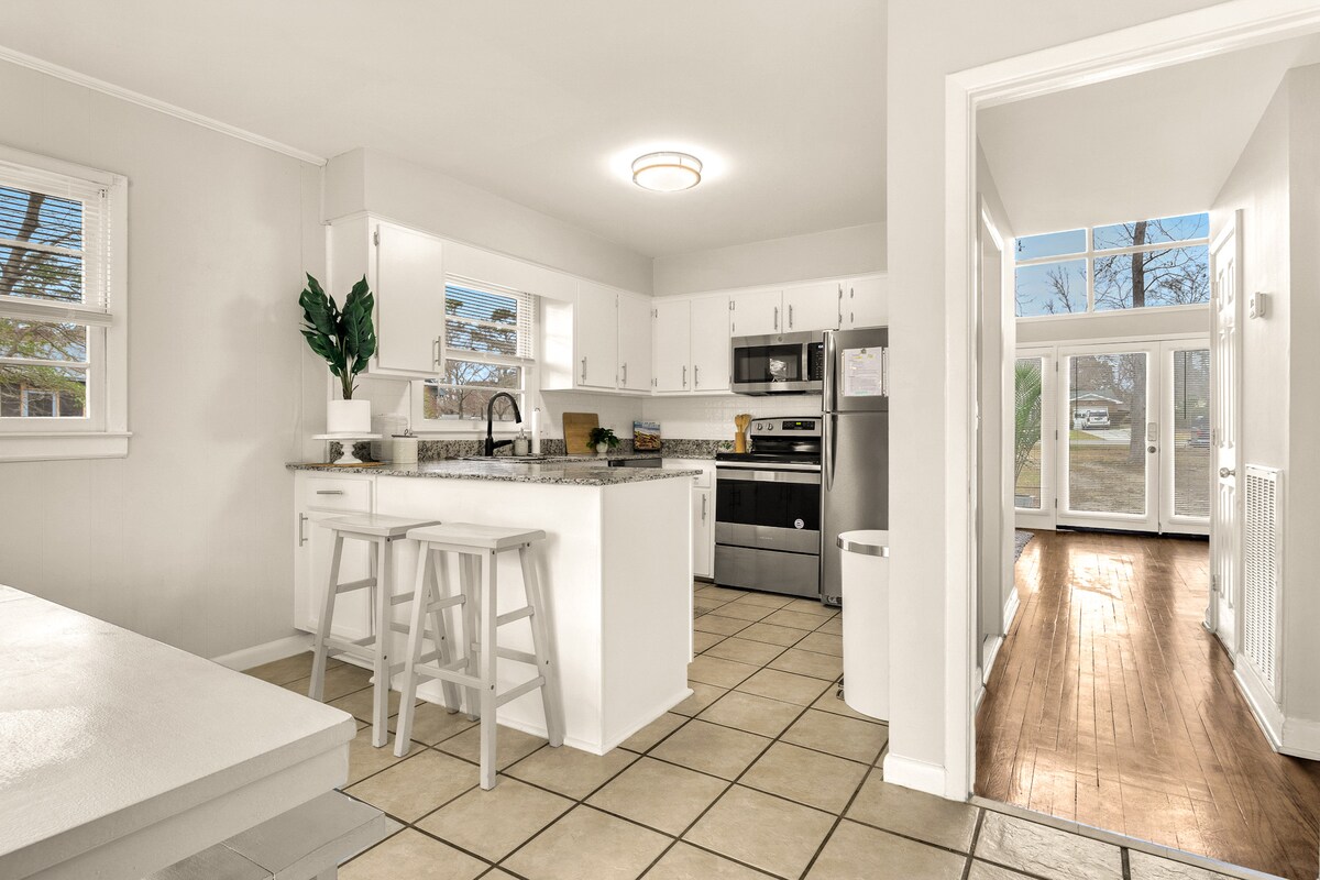 Premišljene podrobnosti za vsakim vogalom obljubljajo, da bodo vaše počitnice mirno zatočišče. Joga na terasi platforme, predpražniki, ki so na voljo med bivanjem. Preberite knjigo v viseči mreži, ki je zasenčena z drevesi magnolije. Kuhinja je založena. Samo 15-20 minut do zgodovinskih restavracij v središču mesta in enako blizu lokalnih restavracij na plaži. Odvijanje na vodnih poteh? Pripeljite čoln/kajak/SUP, dovolj prostora za parkiranje ali shranjevanje igrač. Javna rampa za čoln do ICW, ki je oddaljena manj kot 2,5 km.
