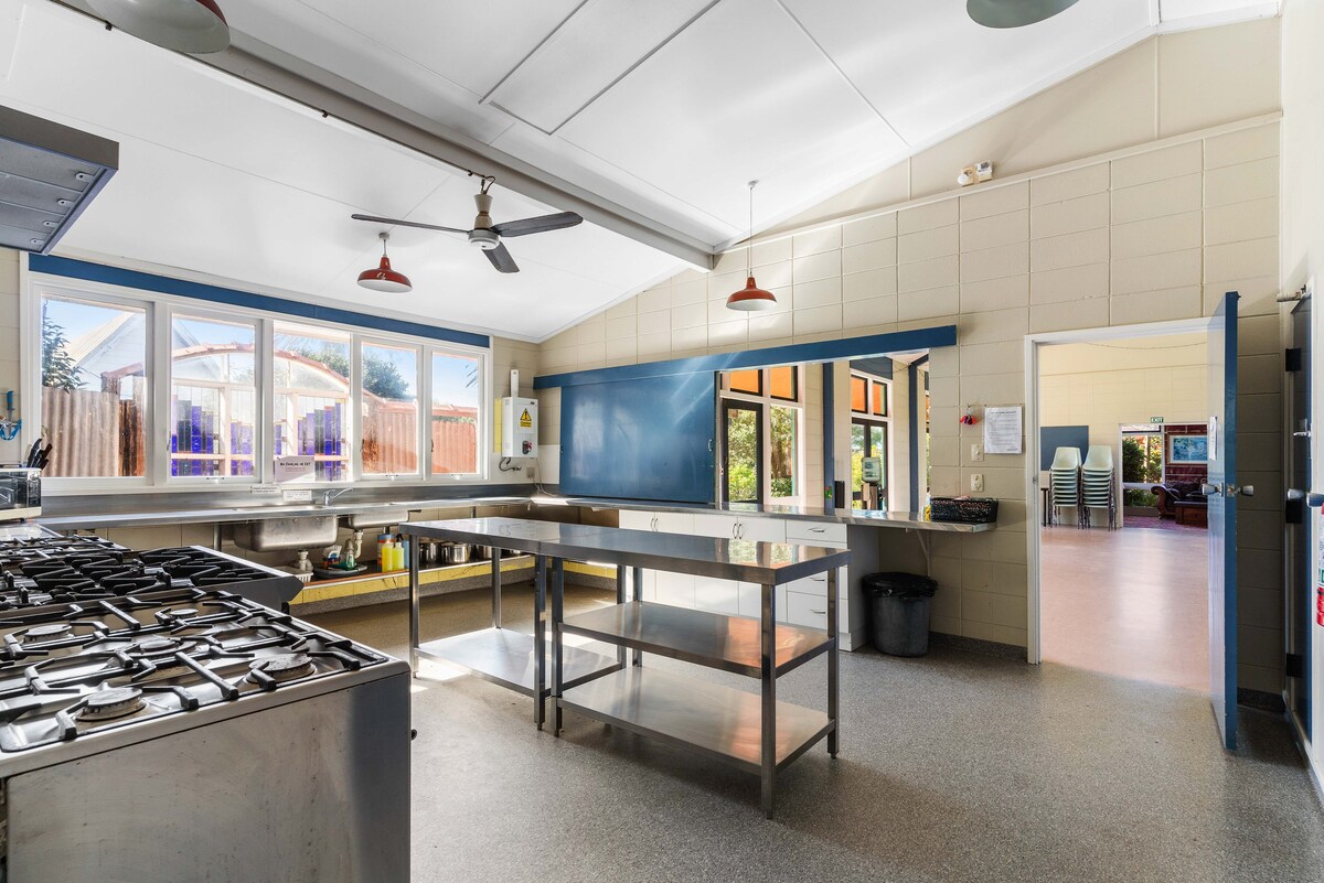 Our brightly coloured ,Main Camp is a fully self contained haven just 150m from one of New Zealand's most beautiful beaches! Sleeping up to 86 guests in bunk style accommodation, this is the perfect place to spend your family reunion, school camp or group getaway. Featuring two lounge areas, a well appointed kitchen & dining hall, large rec hall, pay per use laundry & two large bathrooms. **Rates listed are for 40 people** Additional guests are NZD$20 per person p/night payable direct.