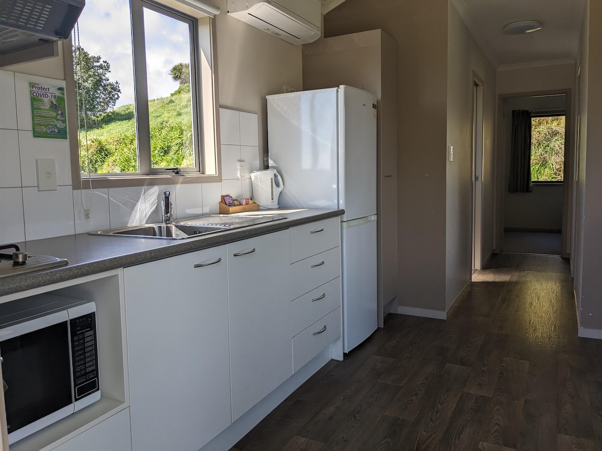 This fully self-contained unit has two separate bedrooms, toilet & shower and full kitchen. With a queen bed in one room, a single bed and a set of bunk in a separate bedroom, plus a sofa bed in the living area. Enjoy the sea view from your balcony (Motel 25 has limited sea views. ) or relax indoors with a TV and heat pump. Linen and towels, tea &; coffee are supplied, with a daily service.<