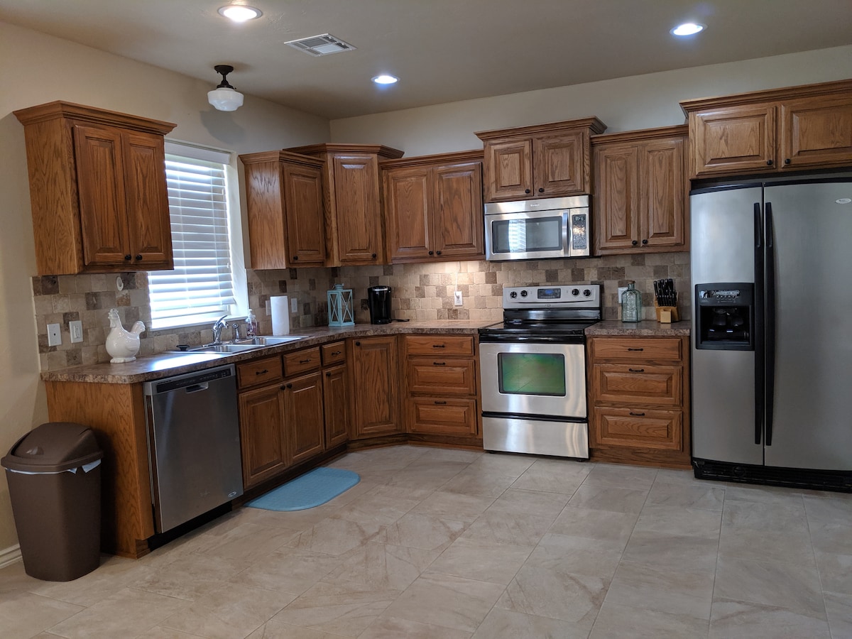 Mirna zasebnost! Popolnoma prenovljeno čudovito 3 spalnico, 2 kopalnici, 2 garaži za avtomobile, nevihtno zavetje, zasebnost ograjeno dvorišče ima dostop do terase iz francoskih vrat iz dnevne sobe. Popolna kuhinja, vsi aparati in posoda. Osnovna bdrm w/velik sprehod v omari in stropnem ventilatorju. Visokohitrostni internet in Wi-Fi, 3 pametni televizorji z mravljami visoke ločljivosti. 65-palčni televizor v dnevni sobi; 50 "v glavnem BR. Roll zgornja miza, usnjen kavč, dvojni naslonjeni sedeži. Uživajte v čisti vodi iz sistema za vzvratno osmozo na kuhinjskem koritu in ledomatu.