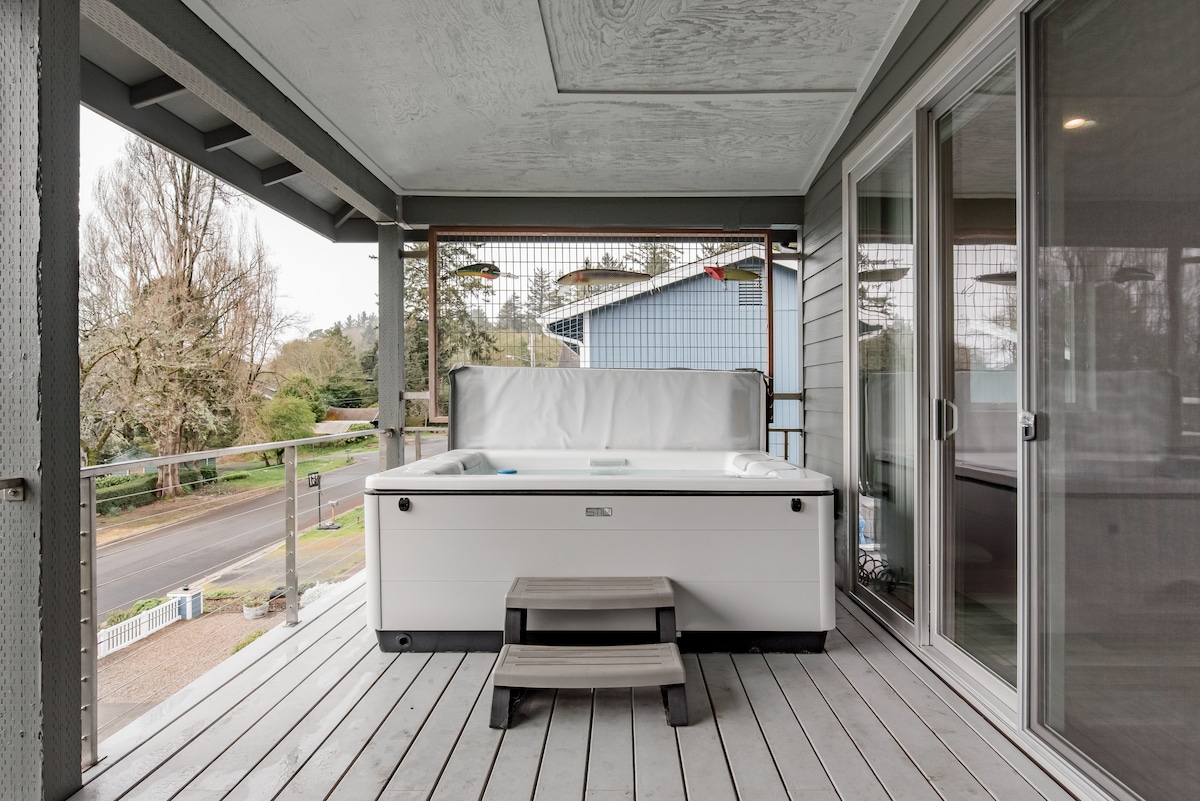 Zabava z vso družino v tem prostornem, čistem in na novo prenovljenem obalnem prenočišču v središču Depoe Baya v Oregonu. Sprostite se na 20-metrski terasi ob oceanu z najboljšim opazovanjem kitov in pogledom na sončni zahod v mestu. V prenočišču lahko spi do sedem oseb na posteljah/futonih s prostorom za nahrbtnik v igri ali dveh (tudi mi jih imamo!). Kabelske pametne televizije, hiter Wi-Fi z namenskim delovnim prostorom za dve osebi ter popolnoma opremljena kuhinja in dve kopalnici. Poleg tega pa še udoben kamin.