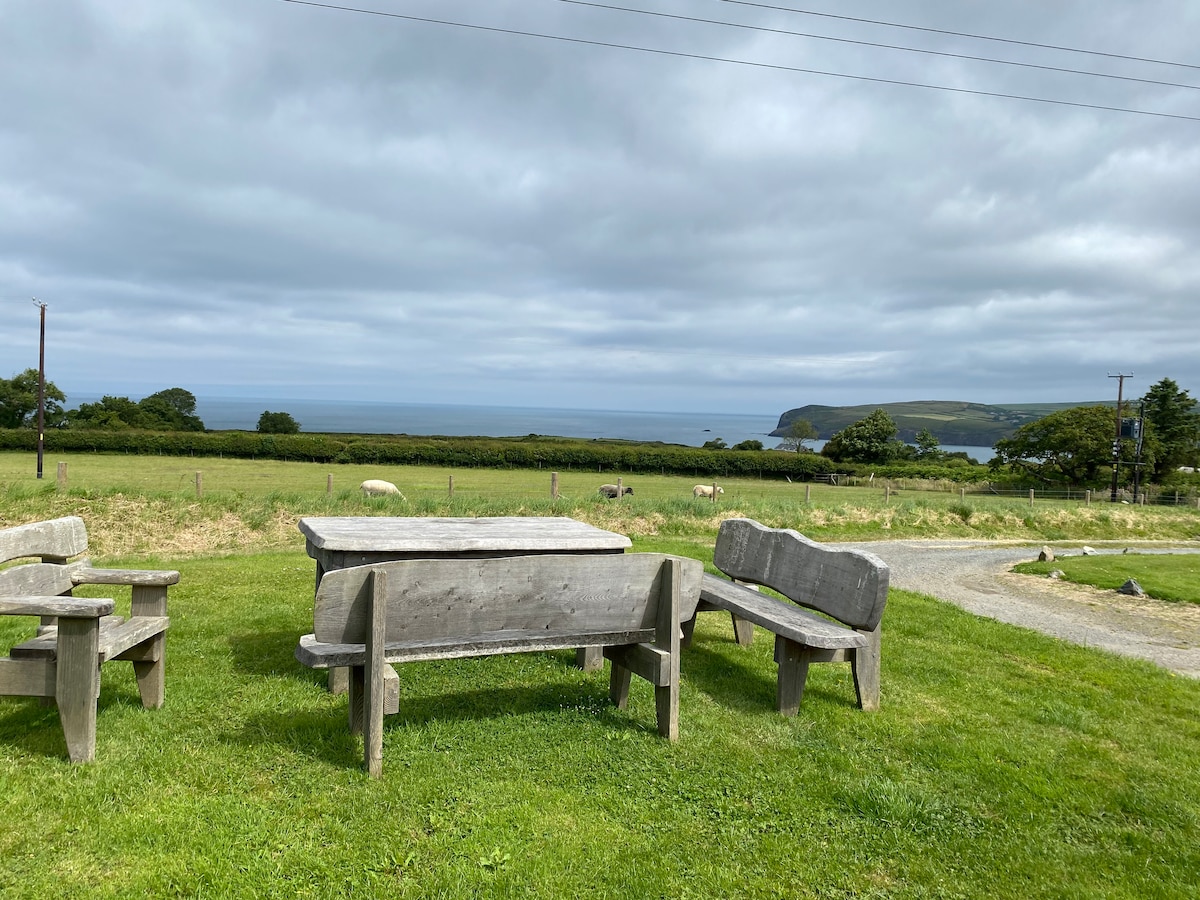Romantična hiška na deželi Pembrokeshire na čudovitem zemljišču s savno, naravnim plavalnim ribnikom (odvisno od dežja), igralnico in kajaki. Hrib se sprehaja po pragu, osupljive plaže in pečine v bližini. Opazujte se iz udobne zakonske postelje. Sklonite se ob štedilniku na drva (brezplačen les). Velika kopalnica s kadjo, prho in talnim ogrevanjem. Dobro opremljena kuhinja z aparatom za kavo. Pokrit zunanji prostor za sedenje z ognjiščem in žarom. Optični internet, pametna televizija (Netflix itd.). Dva lepo vzgojena psa sta dobrodošla.