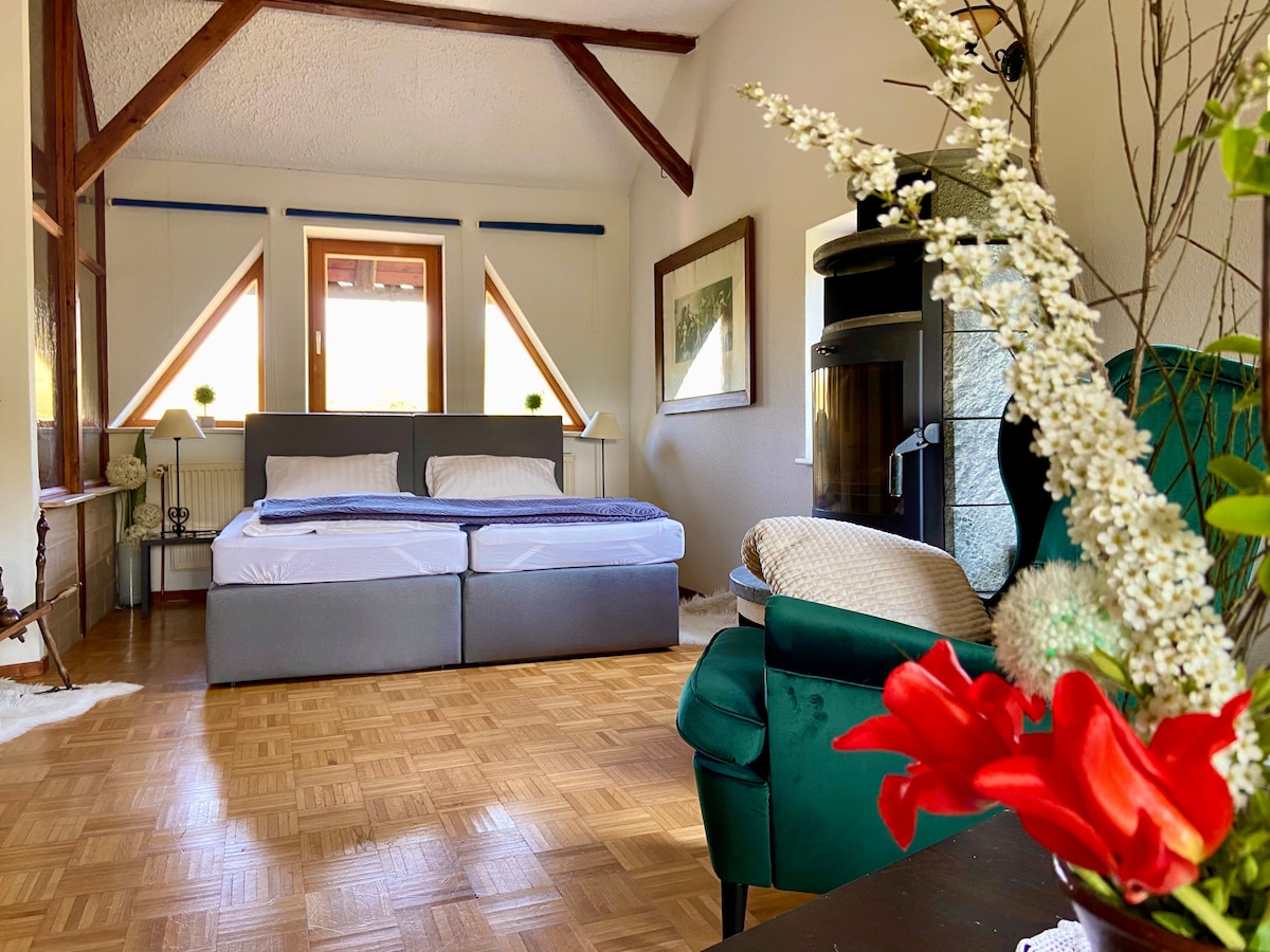 Weitab vom dörflichen Treiben inmitten von Wiesen und Feldern befindet sich unsere Ferienwohnung auf einem historischen Mühlenhof. Im Jahr 1311 erstmalig erwähnt gehört sie zu den ältesten Anwesen im Ort Die Gästesuite (Müllerstube) ist eine Einliegerwohnung im Erdgeschoss des Wohnhauses und separat abschließbar. Du findest eine Küche mit Koch- und Essgelegenheit vor, ein Ankleidezimmer, ein Badezimmer mit Dusche sowie ein geräumiges Schlafzimmer mit einem Doppelbett und zwei Einzelbetten.