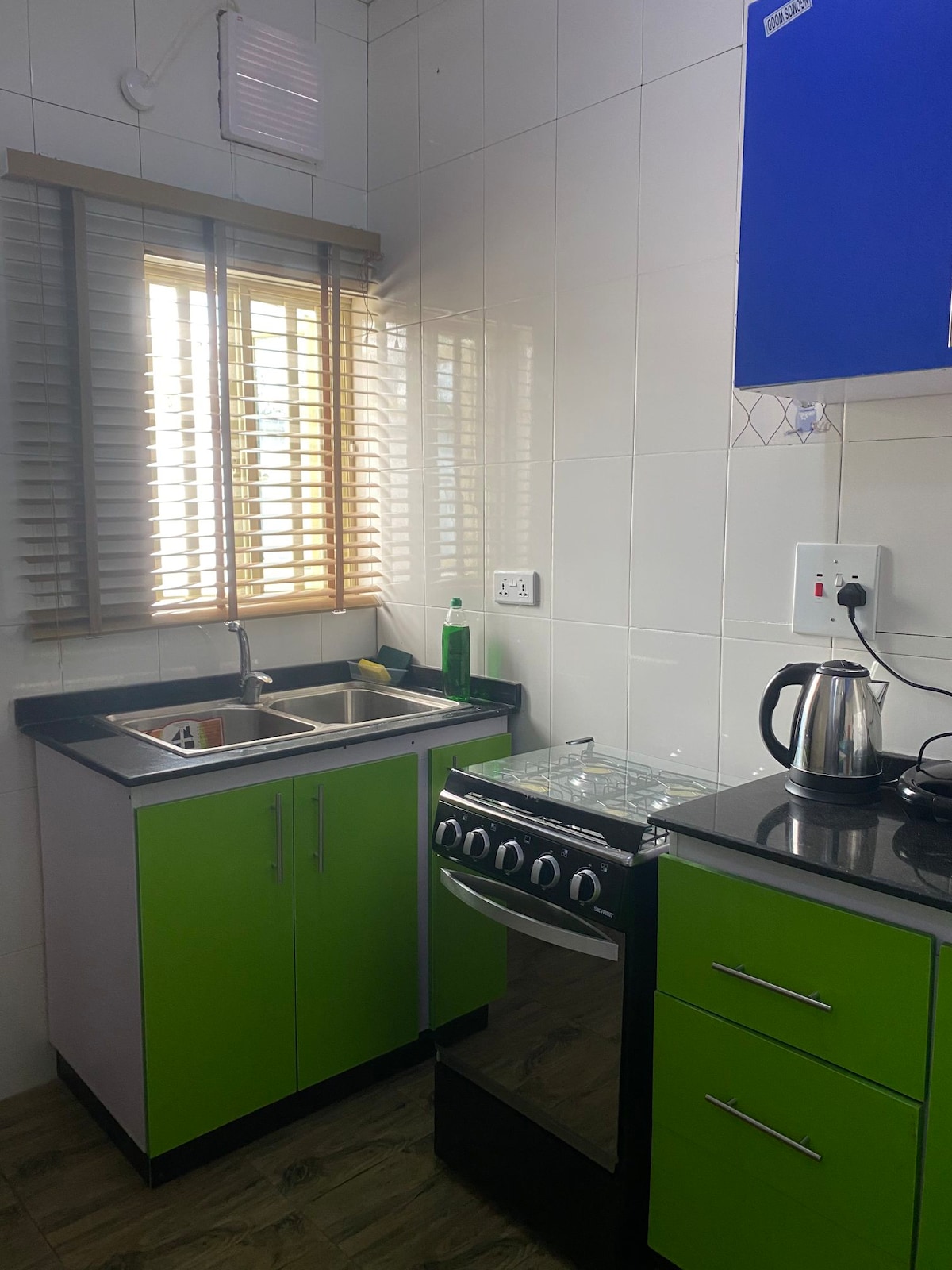 Celotna skupina se bo počutila udobno v tem prostornem in edinstvenem prostoru. Izjemno opremljen dom daleč od doma, udobno dvosobno stanovanje. Zelo prostorne ensuitre spalnice; glavne sobe in sobe za ljubice. Pametni televizor z naročninami na Netflix in Compact Dstv. Lepa in umska sproščujoča umetniška dela Pripravljena kuhinja; popolnoma opremljena s plinskim štedilnikom, mikrovalovno pečico, mešalnikom in drugimi kuhinjskimi pripomočki DRUGI OBJEKTI: bazen Mini Telovadnica Pralni stroj