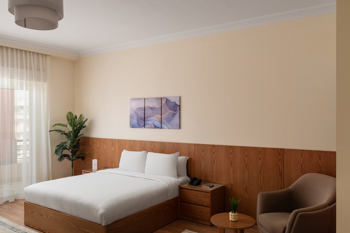 Pobeg svobodnega duha – čebelji panj StayBee v boemskem slogu, poln tekstur, barv in mehke svetlobe. Uživajte v razkošni kopalni kadi s pogledom na mesto, zasebni kopalnici, mini baru, pametni televiziji, aparatu za kavo in grelniku za vodo, klimatski napravi in hitrem Wi-Fi-ju. ✔ Non stop samostojni vstop ✔ Posteljnina hotelske kakovosti ✔ Dnevno čiščenje je na voljo ✔ Tiha soba kljub osrednji lokaciji ✔ Hiter Wi-Fi (200 Mb/s) 📍 Najboljša lokacija v središču Kaira • koraki do Egipta • Restavracije so dosegljive peš • 30 minut do piramid in letališča