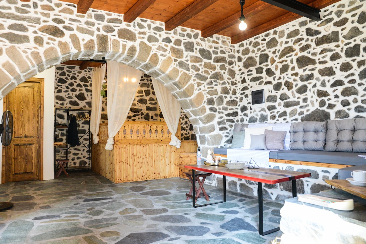 Sprostite se v tem mirnem kraju.V isti namestitvi z dvema več Airbnbjevima hiškama,ki imata kuhinjo in dnevno sobo ter dostop do kioska z električno energijo ,kjer lahko delate z prenosnim računalnikom ali večerjate ali pa se samo sprostite.Morje je oddaljeno 30m,za hiter skok ne glede na to, kakšen trenutek dneva ali noči želite.Mandraki, največja vas otoka,kjer so minimarketi,restavracije, bari,je na 1 km,15 min hoje peš,tik ob pristanišču.