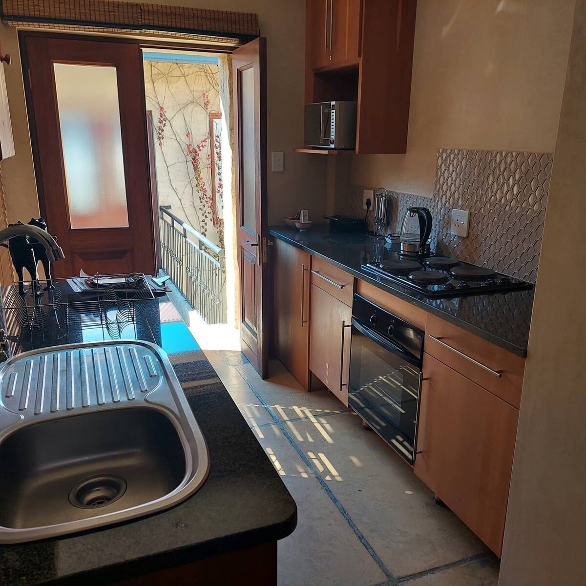 To prostorno studio stanovanje z osnovnimi potrebščinami, grelnikom vode, mikrovalovno pečico in televizijo z izbranimi kanali odprtega pogleda ter skupno kuhinjo. Zasebna terasa z opremo Braai in osupljivim razgledom.