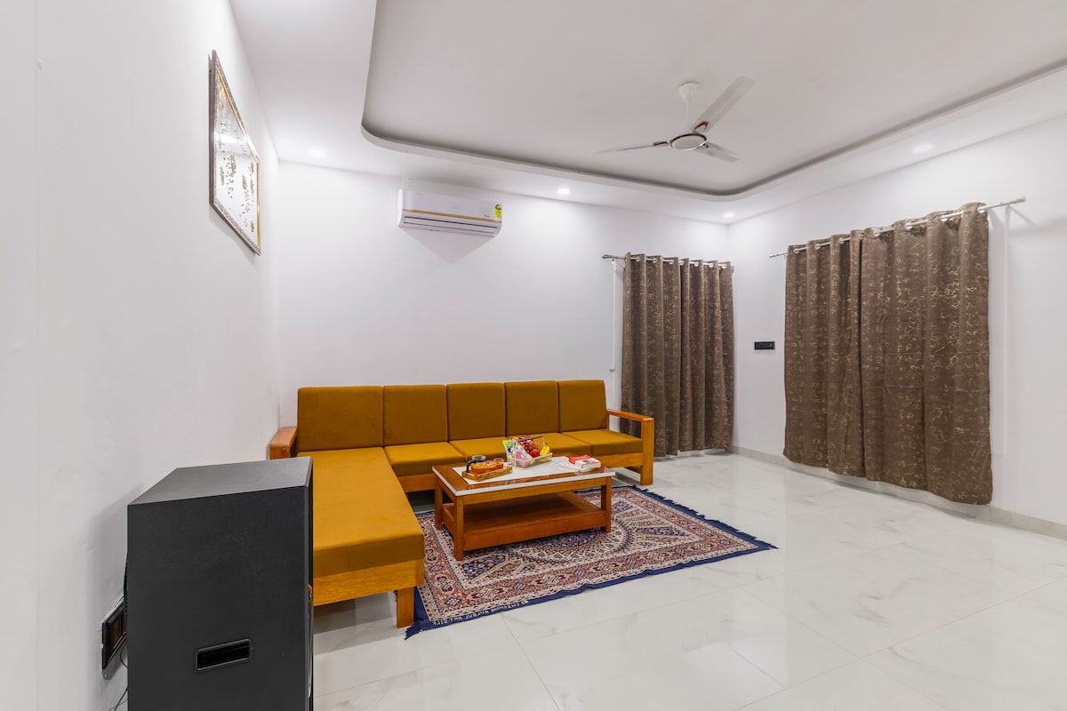 O tej namestitvi:- ✨ Glavna spalnica – vključuje super veliko zakonsko posteljo z izjemno razkošno vzmetnico Sleepwell (v vrednosti 1,3 ₹) za neprimerljivo udobje, 3-sedežni plišasti kavč, deljeno klimatsko napravo, pametni stropni ventilator, 65-palčni Android QLED TV z zvočnikom JBL, pritrjeno kopalnico in premišljeno oblikovano osvetlitev, ki ustvarja udobno in gostoljubno vzdušje. 🌿 Prostorni vrt – uživajte v zasebnem vrtu s površino 330 kvadratnih metrov in elegantnim prostorom za sedenje, ki je kot nalašč za noči ob mesečini z elegantnimi toplimi stenskimi lučmi za mirno vzdušje.