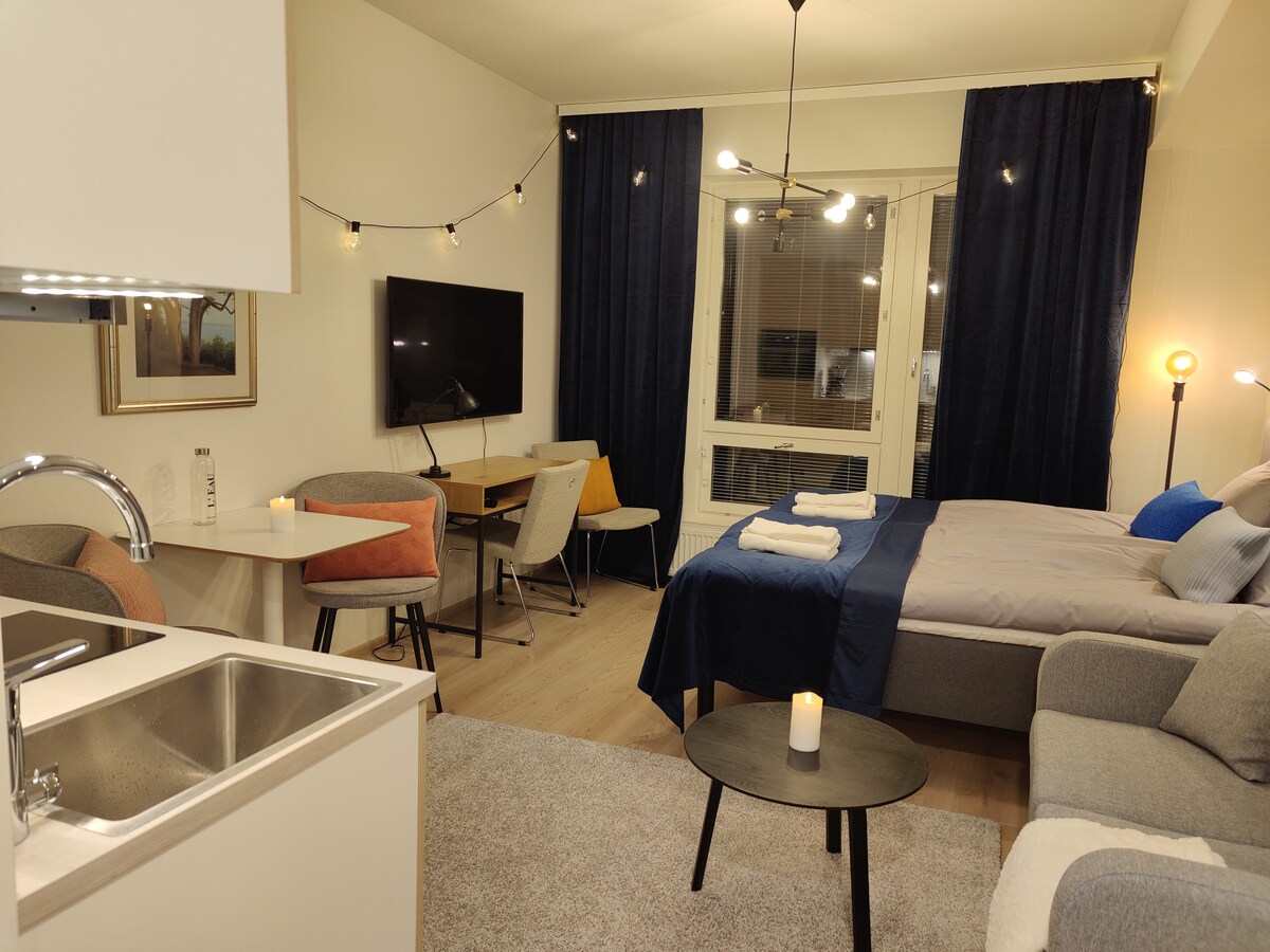 - Air cooler - Wifi - Refreshments - Blackout curtains - Self check-in - Washing machine - Smoke detectors, first aid kit, and safety locks Stylish studio apartment in the city center, with views of the Ratina and Koskikeskus shopping centers and the Stadium. Nokia Arena is a 5-minute walk away. Quiet apartment on the 4th floor, no elevator. Note! Final cleaning is not included in the price, guests are required to clean the apartment.
