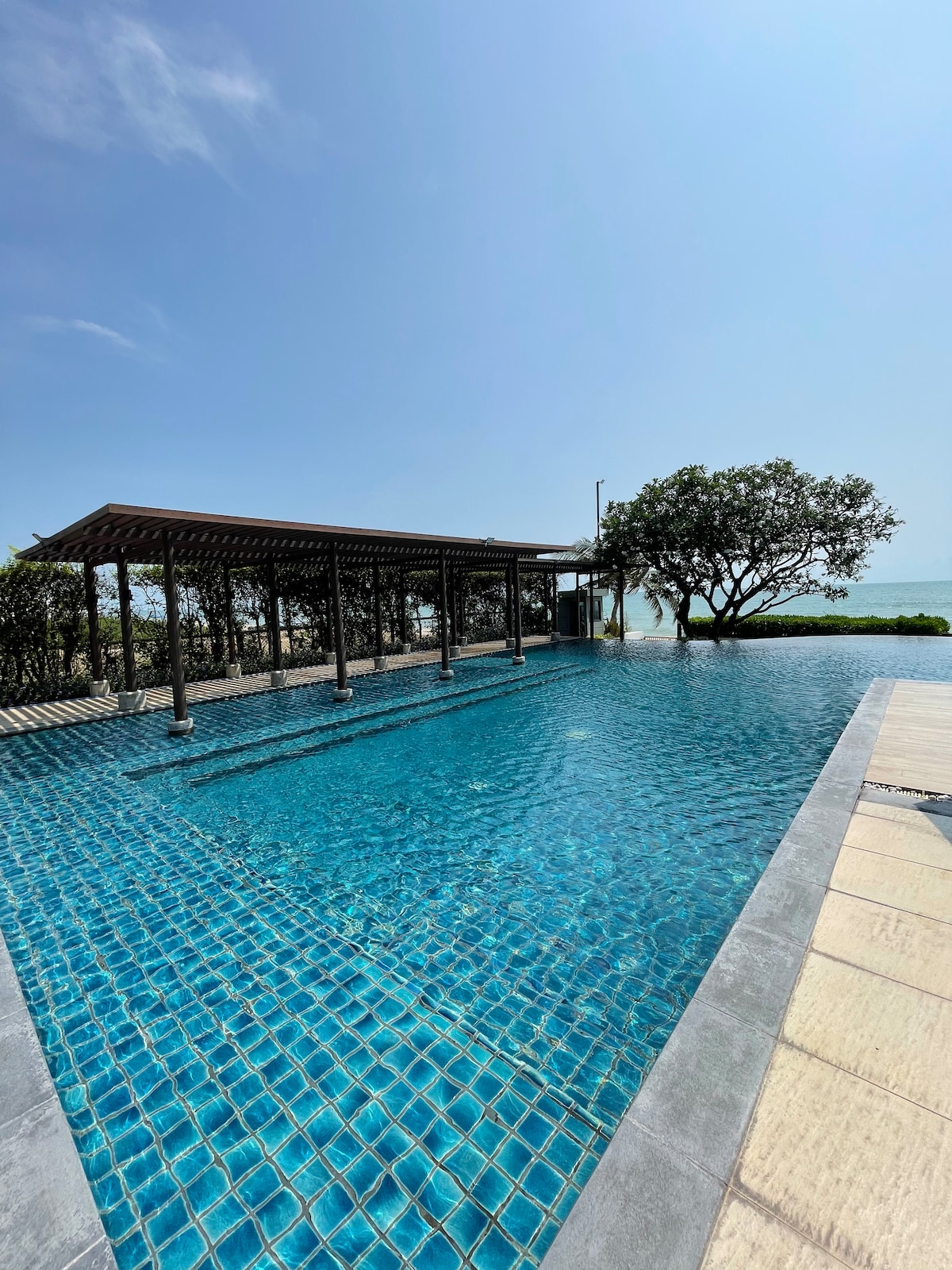Uživajte v mirnih, zasebnih počitnicah ob plaži s površinami v zgornjem nadstropju s površino 105 m2. - Sprostite se s spektakularnim razgledom na morje v Cha am na Tajskem. Oprema vključuje zasebno plažo, 2 javna bazena, savno, recepcijo, pralnico, storitve sobarice, TAJSKO masažo, Wi-Fi, 24-urno varnost, fitnes in čudovit vrt. Le 20 km od Hua Hina in 2,5 ure vožnje od Bangkoka. Popolna izbira za pare, družine ali skupine prijateljev, ki iščejo sproščujoč oddih.👍🏻