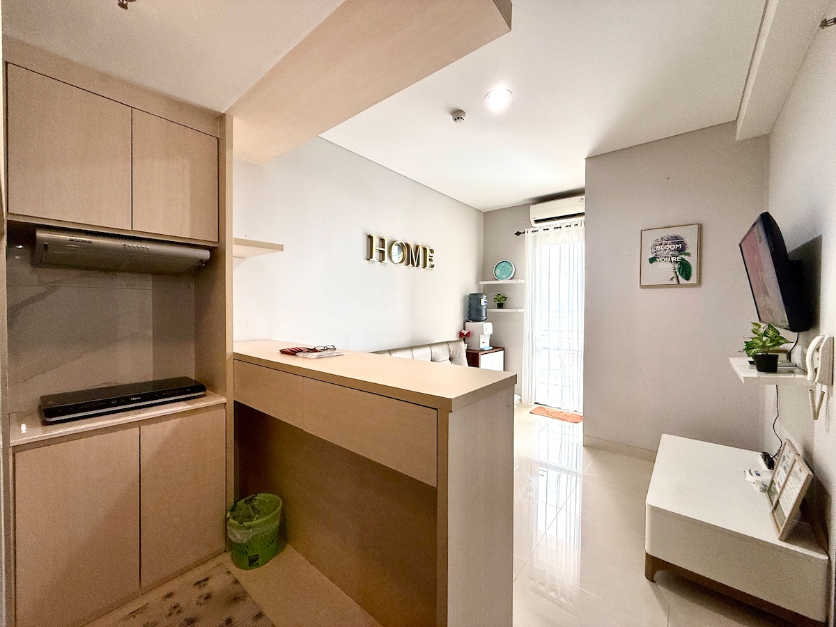 This unique place has a style all its own. Recently renovated top floor studio unit at Pollux Habibie Apartment Bluhen Tower. One of a kind. Apartment is on top of shopping mall. Walking distance to laundry, cafes, bars, convenience stores, salon and eateries.