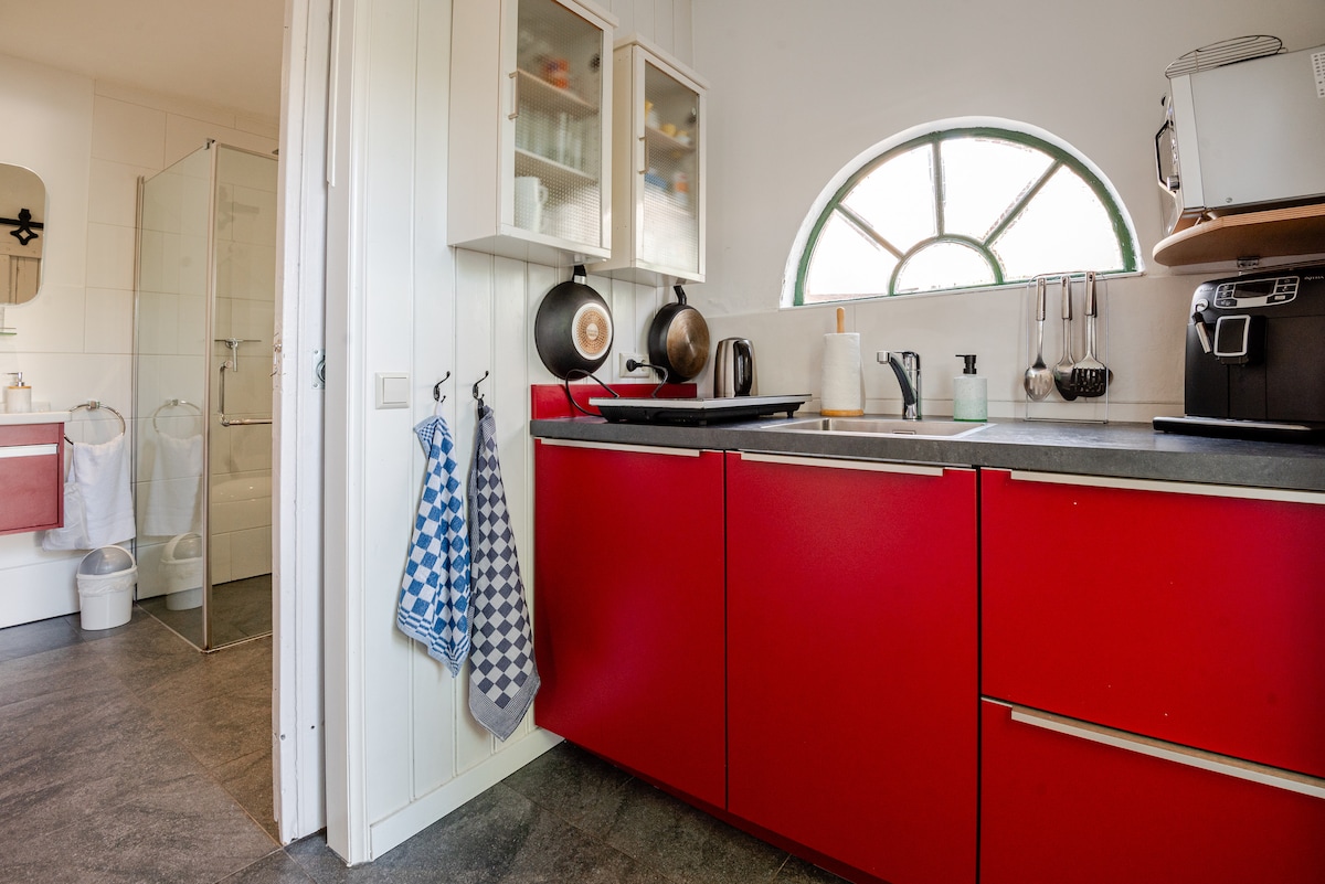 Dobrodošli v Noordwijku! Mi smo Remco, Berber in Maike (11). Naša udobna ~25 kvadratnih metrov velika hiša za goste je na voljo za zakup za 2 gosta. Uživali boste v zgornji spalnici (nizek strop in strmo stopnišče) z dvema enojnima posteljama in televizorjem. Dnevna soba je spodaj, kopalnica z WC-jem in prho. Na voljo je kompaktna kuhinja z umivalnikom, hladilnikom, dvojno kuhalno ploščo in mikrovalovno pečico/pečico. Kuhinja je opremljena za pripravo osnovnega obroka. Hiša za goste ima zasebni vhod z dostopom z ulice.