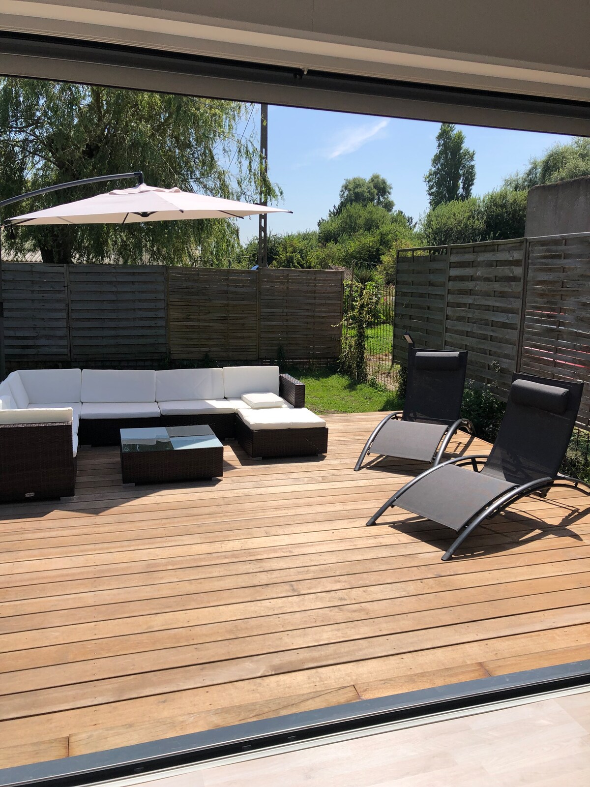 Belle maison individuelle familiale contemporaine, très claire. Ambiance empreinte de sérénité. L'impression d'être dehors. Joli jardin exposé S/O sans vis à vis. Equipement complet. Idéale aussi bien pour des réunions de travail qu 'avec des enfants Bien située pour faire une halte au calme dans la région lilloise, organiser une réunion de travail, se retrouver en famille ou entre amis, visiter ses proches. Vous êtes accueillis dans une maison familiale Draps, éponges et lits faits sont compris