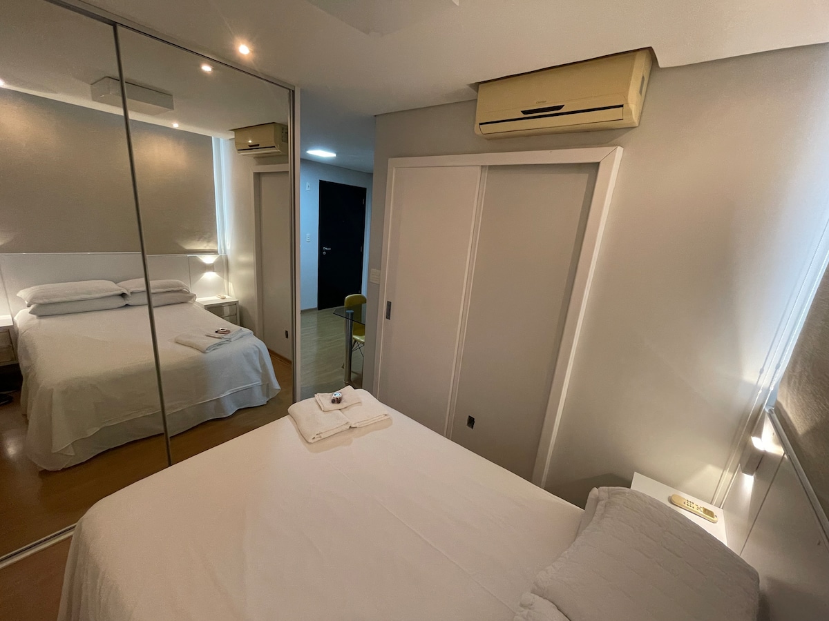 Sodobno garsonjera, ki se nahaja 300 m od parka Vila Germânica - kraj dogodkov, kot je Oktoberfest. Obkroženo z restavracijami in bari se nahaja v bližini parka Ramiro Ruediger, glavnega območja za preživljanje prostega časa, pohodništva in vadbe v Blumenauju. Vse za vaše udobje: pametna TV 43", deljena klimatska naprava, 240 MB Wi-Fi, kuhinja z Brastemp hladilnikom, mikrovalovna pečica, štedilnik, aparat za kavo, pečica, pralni in sušilni stroj, posteljnina in seveda vabljiva zakonska postelja (Queen)!