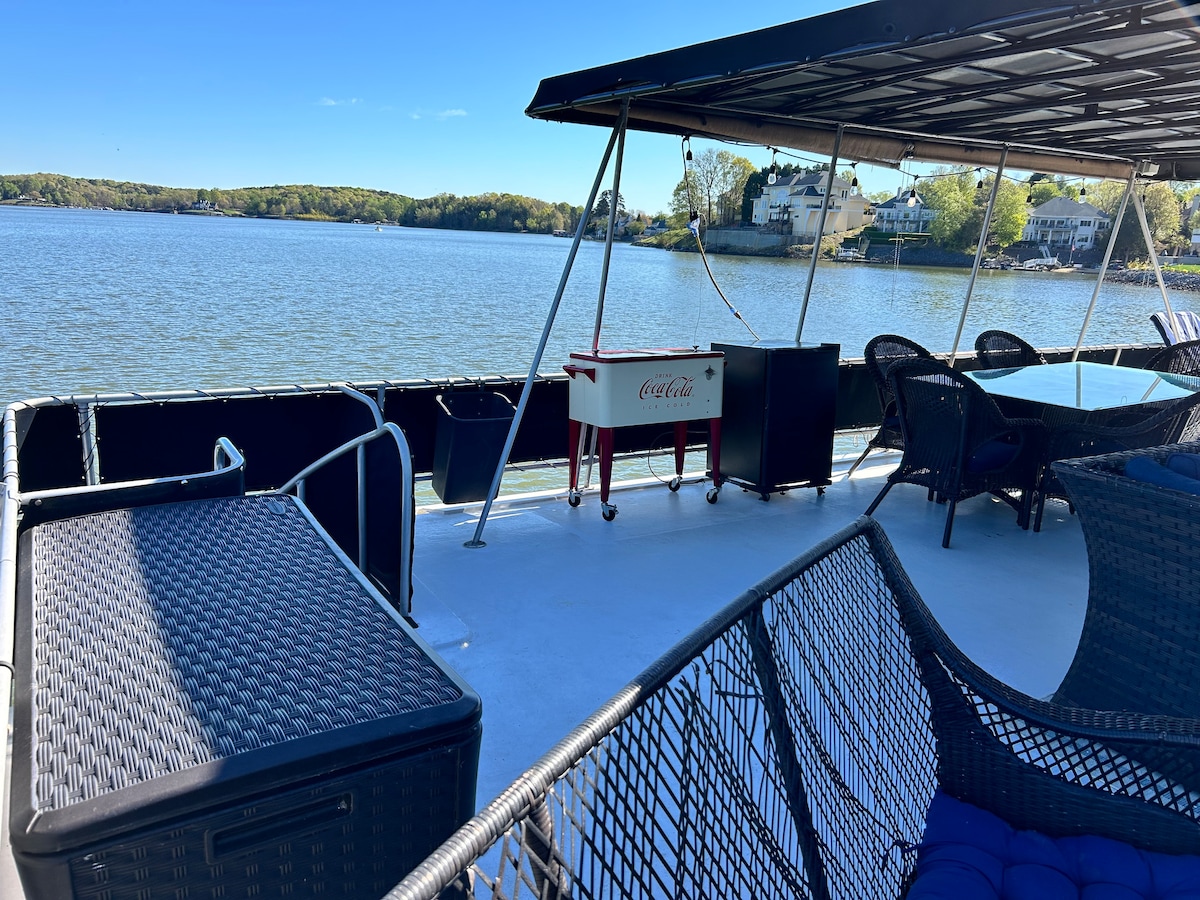Book your Autumn stay and cruise now. The fall colors surround the lake. Completely renovated in 2024. Absolutely nothing like it on Lake Wylie. Owned and operated by certified Coast Guard Captain. Available as AirBnb and also for an additional fee lake tours are available. 2 hour minimum. The houseboat is at Joyners Marina on Lake Wylie across from Poppa Docks, and has vast lake views and the sun rises and sets over the houseboat. Treat yourself to a staycation and relax on the lake.