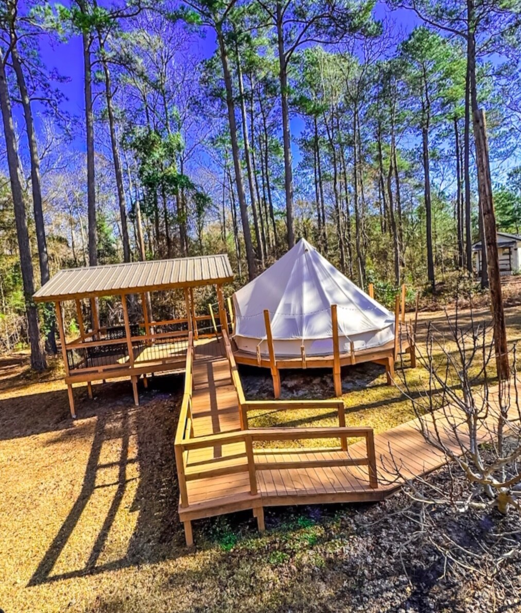 Escape the ordinary and immerse yourself in comfort and nature while luxury glamping. Nestled in a serene forest setting, our stylish tent offers the perfect blend of rustic charm and modern amenities. Enjoy a plush king-sized bed, cozy linens, heated mattress pad, ceiling fan, and a private fire pit—all just steps away from a private disc golf course. Whether you're looking to unplug and recharge or simply try something new, this is your dream getaway under the stars.