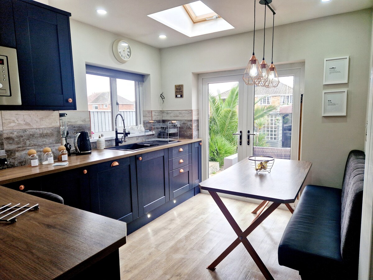 Modern, light and airy end-of-terrace house, consisting of a fully equipped dine-in kitchen and living room downstairs and two double bedrooms and bathroom upstairs as well as your private front and rear gardens (and you'll always have the sun in either the front or rear garden). The house is located a 20 minute drive from Cleethorpes Beach, where you can park for free within walking distance to the beach. Children will also love that in the season an ice cream van comes round in the evening.