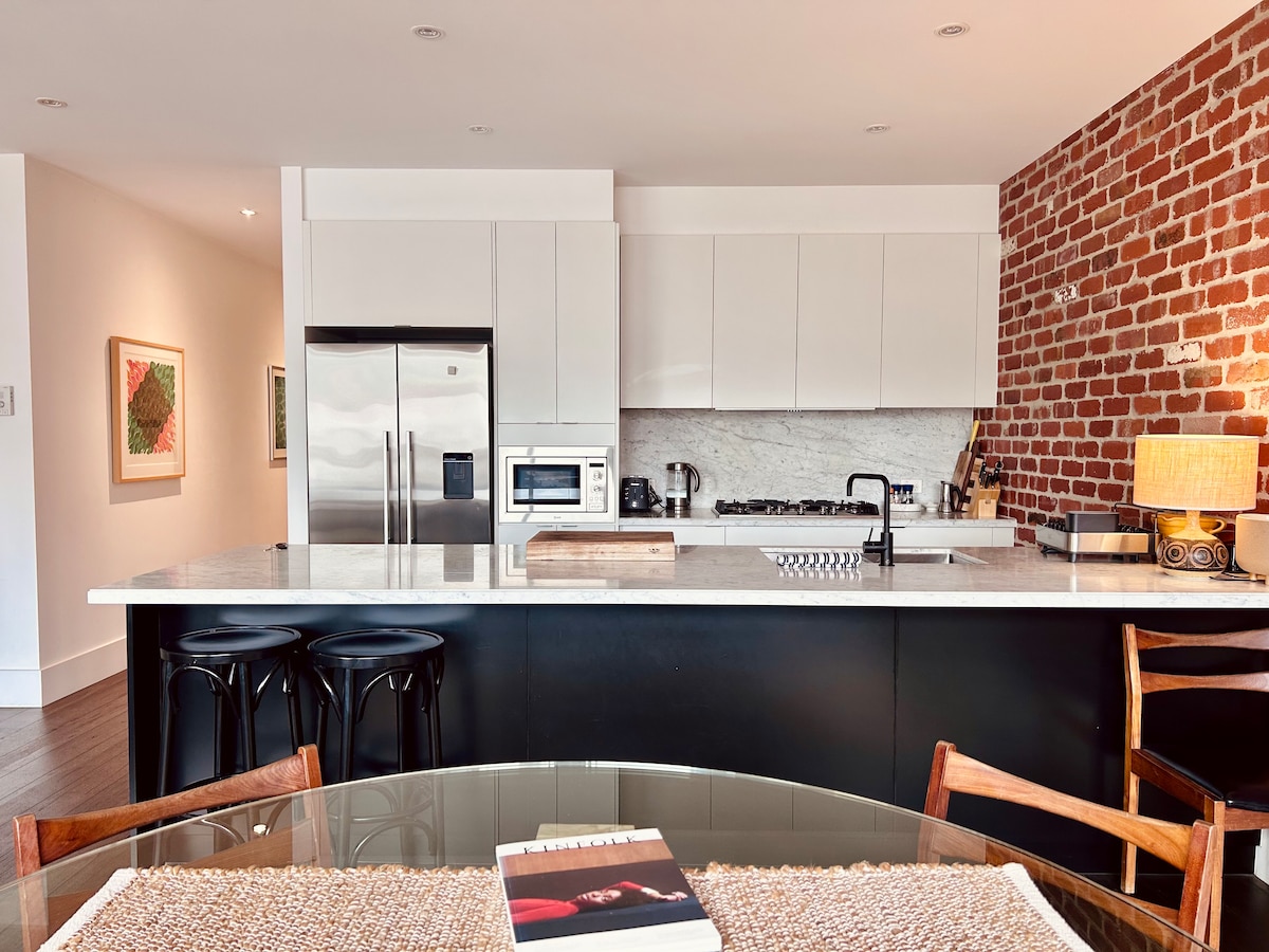 Bespoke and Beautiful 1 bedroom apartment in a converted warehouse. Walking distance to public transport to the city and Flemington racecourse. With restaurants, cafes, breweries, distilleries, bakeries and coffee roasters all in close proximity. In the apartment, natural surfaces and wood finish walls make for a very cosy feel. A height adjustable desk for working from home. We love it and are sure you will too.