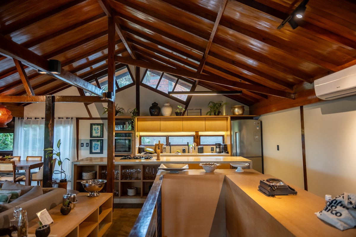 Located on a hillside in the most exclusive area of Novo Airão, this spacious chalet is ready to welcome you. The house offers a stunning view of the Anavilhanas Archipelago and the sunrise. There are 3 comfortable bedrooms decorated with contemporary furniture: 2 bedrooms with balconies facing the garden, 1 bedroom with a large window and a view of the vertical garden. It features an open-plan kitchen, a cozy living room, an infinity pool, and the sound of birdsongs.