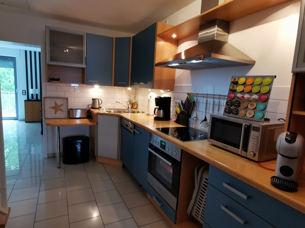 Pozabite na skrbi v tem prostornem in mirnem prostoru. V letu 2015 je bila popolnoma posodobljena in nenehno okrašena hiša s 152 kvadratnimi metri, do 8 oseb in 2 dojenčka ima dovolj prostora , hiša ima talno ogrevanje, visokokakovostno kuhinjo, pralnico, pralni stroj, sušilni stroj, 2 kopalnici , 1x prho ter 1x prho in kad. 3 spalnice po 1 TV .WLan. . Velika dnevna jedilnica, odprta kuhinja, dnevna soba s kaminom. Čudovit vrt, gosto zasaditev zaslona, pokrita terasa.