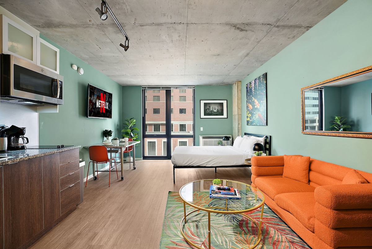 Step into a true urban retreat that has been fully renovated, offering 1,000 sq. feet of inspiring space. The modern European kitchen awaits your culinary adventures, while the serene living room, adorned with a large fireplace and 75" TV, invites relaxation. Flow seamlessly into the airy bedroom, featuring a king-size bed and a dedicated workspace. The bathroom, with its floor-to-ceiling tiles and luxurious rain shower, exudes elegance. For comfort, this unit, fully air-conditioned and heated.