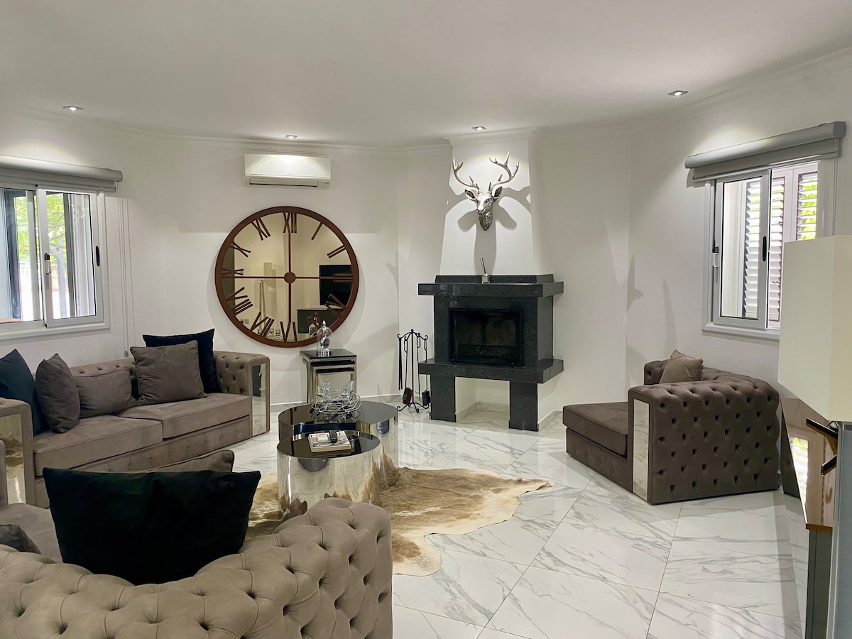 Vila, ki spada med 5 % NAJBOLJŠIH na Airbnbju. 5 minut od plaže, vodnega parka in igralnice hotela Acapulco, 20 minut do središča mesta Girne. Hiša ima velik kino, masažni stol, razkošno marmornato pohištvo in čarobne panoramske razglede. Gostom je na voljo brezplačen prevoz z električnim vozilom! Ta izvrstna dvojna vila (dupleks) v ograjenem kompleksu s tremi bazeni ima zasebni vrt, vodnjak, hišico na oljčnem drevesu, mizo za namizni tenis, mangal, gugalnico, trampolin in dva vodnjaka. Dve trgovini, dve restavraciji in kavarna v bližini hiše.