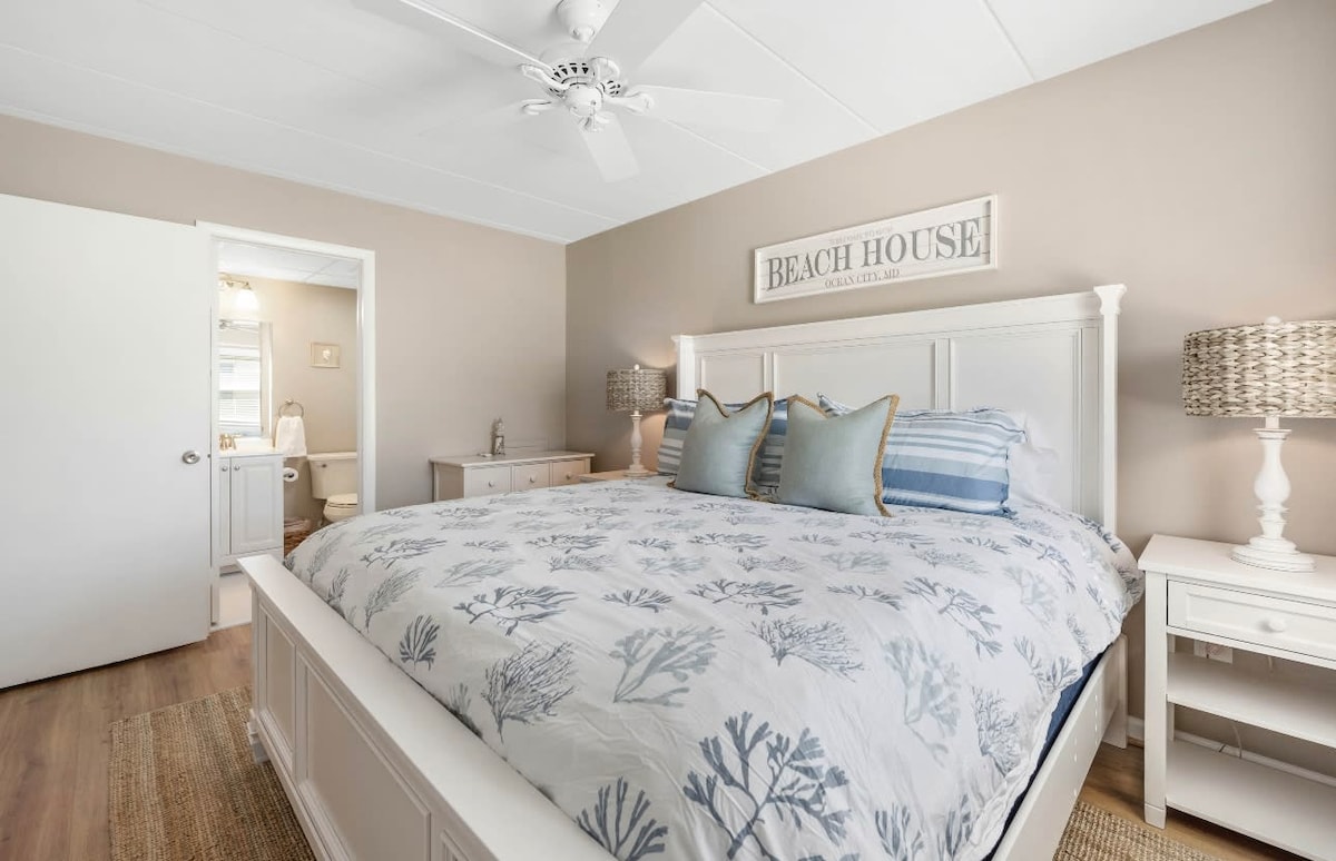 Stopnice do plaže! Popolnoma prenovljeno, svetlo, sodobno in čisto stanovanje s pogledom na ocean z balkonom. Mirno mesto North Ocean City z dostopom do restavracij, avtobusa, 7-11, igrišča za mini golf, gledališča, parkov itd. Popolnoma nove naprave in pohištvo. Brezplačen brezžični internet, zakonska postelja, 60-palčni televizorji. Izvlecite kavč Queen, popolnoma nova kopalnica. Pralni in sušilni stroj v enoti. Kavarna Keurig, polnilna postaja za iPhone. Zasebni balkon. Brezplačno parkirno mesto.