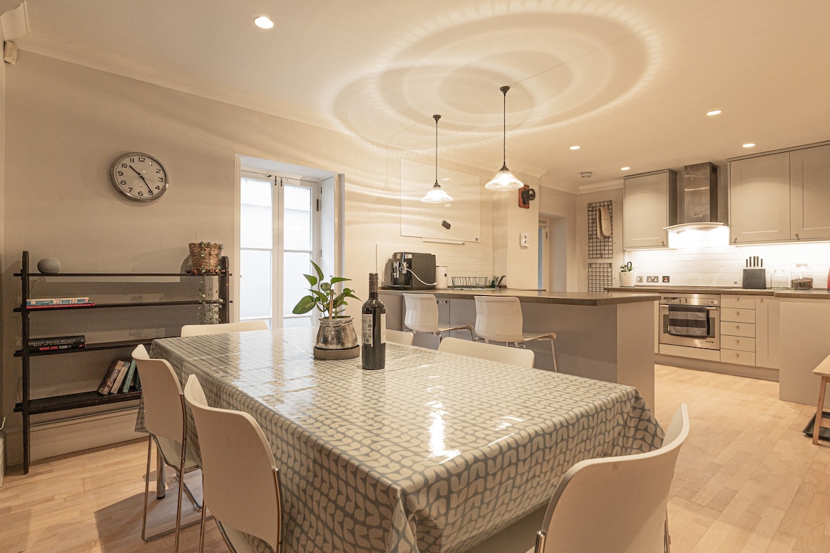 Experience the essence of stylish urban living in a landmark historic building in the heart of Clerkenwell. Quiet & secluded yet just minutes from the buzzing shops, cafes and restaurants of trendy Exmouth Market, this spacious apartment will appeal to architects, designers—or just about anyone with a taste for the very best of London. With a fully-fitted kitchen, dishwasher, oven, washer-dryer and even home cinema setup, it's ideal for business travellers, couples, groups and families alike.