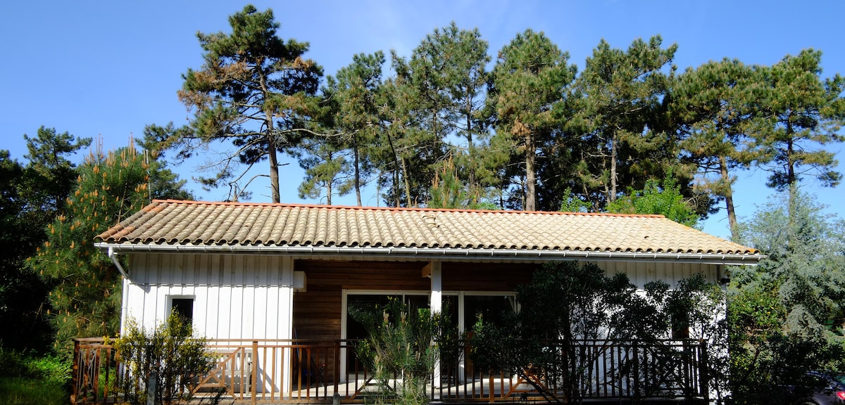 Chalet en bois trois pièces avec une terrasse vue sur la forêt des Landes .Situé à 20 minutes du centre à pied et à 15 minutes de la plage par un sentier ombragé. Au calme, grande terrasse, dont une partie couverte. Petit jardin privatif. Stationnement dans le jardin. Il faut passer par une allée dans le jardin du propriétaire pour accéder au chalet. Les deux chambres ne communiquent que par la terrasse, attention aux enfants en bas age .