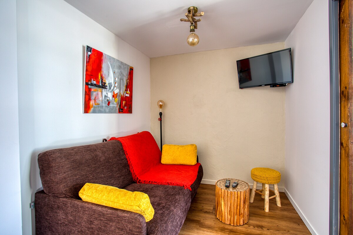 Soba v prenovljenem kontejnerju velikosti 15 m2. Nahaja se le nekaj sto korakov od središča mesta. Neodvisno in ne glede na glavno hišo boste tiho za kratkotrajno bivanje. Dimna okna (učinek ogledala) za zasebnost. Posteljnina in brisače so na voljo. Hitro omrežje Wi-Fi v prenočišču prek vtiča CPL. Klimatska naprava/ grelec. Med vašim bivanjem bomo prisotni v hiši in vam bomo lahko pomagali.