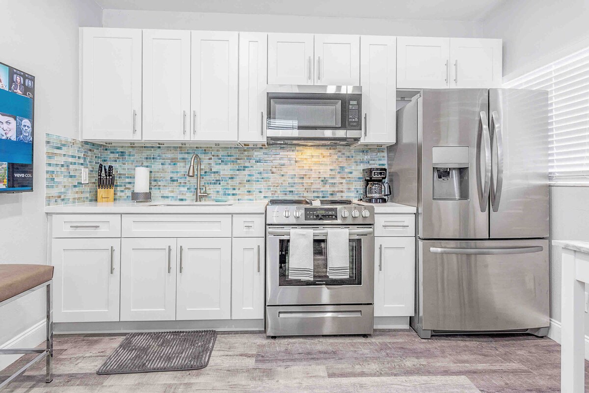 To je na novo prenovljeno sodobno zatočišče iz sredine prejšnjega stoletja v osrčju Pembroke Pinesa. Ta udobna garsonjera je idealna za kratkotrajna bivanja s polno kuhinjo, čudovito posodobljeno kopalnico in prostornim dnevnim prostorom. Sprostite se v udobni zakonski postelji in futonu, ki se odpira na zakonsko posteljo. Vključuje brezplačno kavo, toaletne potrebščine, hiter Wi-Fi in pametno televizijo z aplikacijami za pretočno predvajanje. Potopite se v udobje in slog v tem vabljivem prostoru v živahnem Pembroke Pinesu.